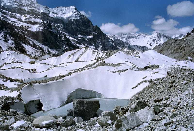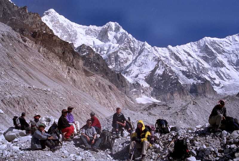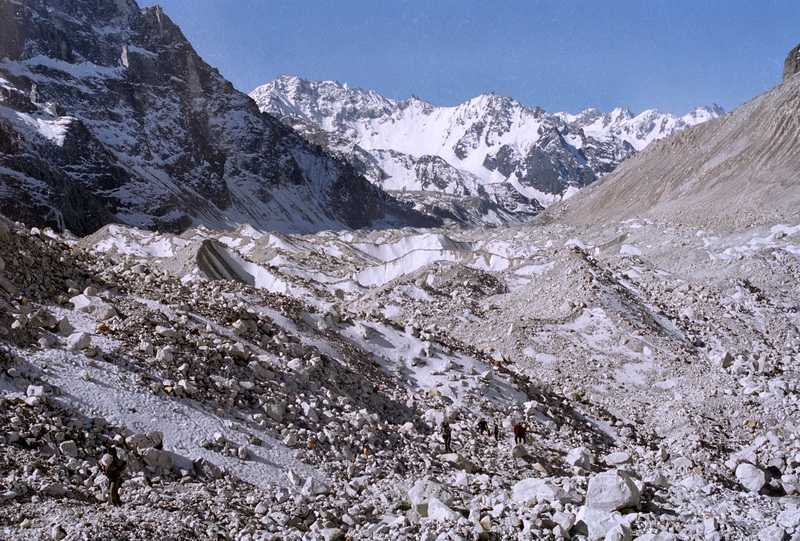 25.04.2003 Dies ist jetzt durch kilometerbreite Landabbrüche nicht mehr möglich. In diesen schießen ununterbrochen große und kleine Steine mit einer unvorstellbar schnellen Geschwindigkeit zu Tale, zerschellen an größeren Felsen, um dann noch schneller und unberechenbarer nach allen Richtungen auseinanderzuspritzen oder regelrecht zu explodieren. 5 Std. laufen wir Richtung Ziel unserer geheimen Wünsche immer auf und ab an gefrorenen Gletscherseen mit Höhlen, an schönen Eisgebilden vorbei und über tiefe, gurgelnde Gletscherspalten hinweg. Entlang steiler Eishänge, immer wieder ausgleitend, kleine Geröll-Lawinen auslösend, auf wegkippenden Steinen, kleinen tiefen Schneefeldern balancieren wir uns vorwärts, ohne das Basislager zu Gesicht zu bekommen. Bereits nach 2 bis 3 km ist ein Lager (Transport-Camp) angelegt, bestehend aus Planen, Tragkörben, Kanistern und Müll. Von hier aus gehen wir nochmals ca. 3 Std. weiter bis auf 4900 m Höhe. 12 Uhr ist als Umkehrzeit vereinbart, es geht denselben „Weg“ zurück. Die letzten Meter hoch auf die Moräne sind eine Tortur, wir sind alle echt fertig. Auf halber Höhe kommt uns Satté, der junge Koch, mit heißem Orangensaft entgegen gesprungen (in Sandalen), um uns zu laben, eine liebe Geste, danke Sat. Im Gletscher ist alles am Arbeiten, am schlimmsten die vielen Steinlawinen von den Bergen links und rechts, dann gurgelnde Schlammlawinen, die sich tief in die tauenden Abhänge fressen. Sobald die Sonne einen Hang erreicht, taut er an und es beginnt das mörderische Bombardement der Steine. Alle aber kehren glücklich nach Oktang zurück. 20 Uhr sinken wir erschöpft in unsere Säcke.