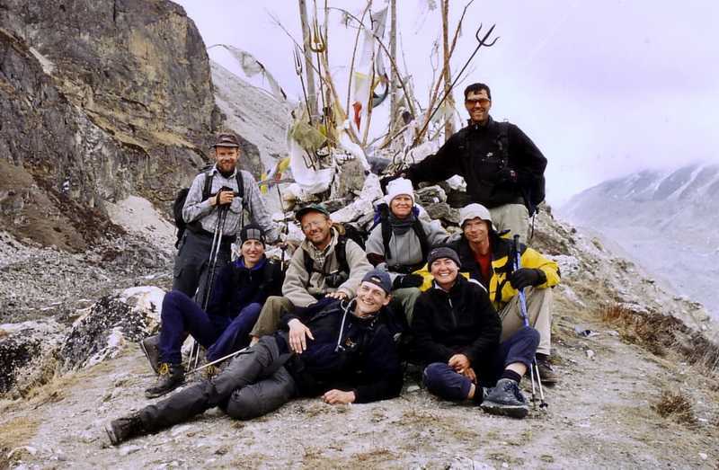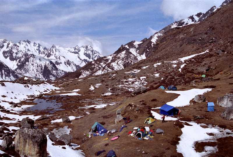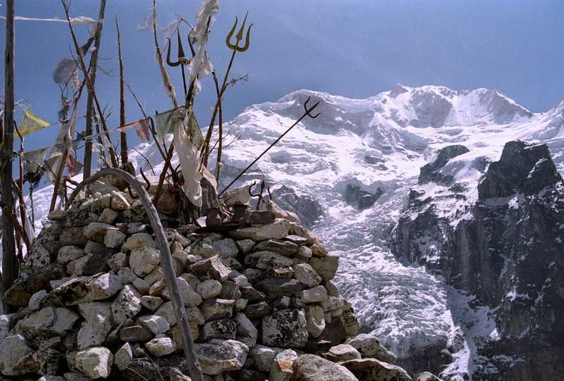 26.04.2003Mietzi, Jörg und ich frühstücken 8.30 Uhr, herrlich ausgeschlafen und in vollem Sonnenschein. Später beobachte ich unsere „Bergsteiger“ mit dem Fernglas, oben liegt bis 1 m Schnee. Wir besuchen die Stupa, laufen weiter bis zum Abbruch der Moräne.