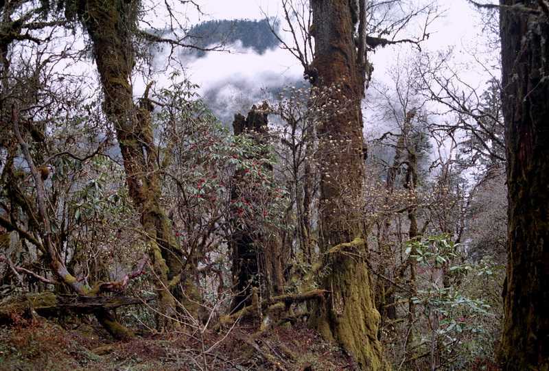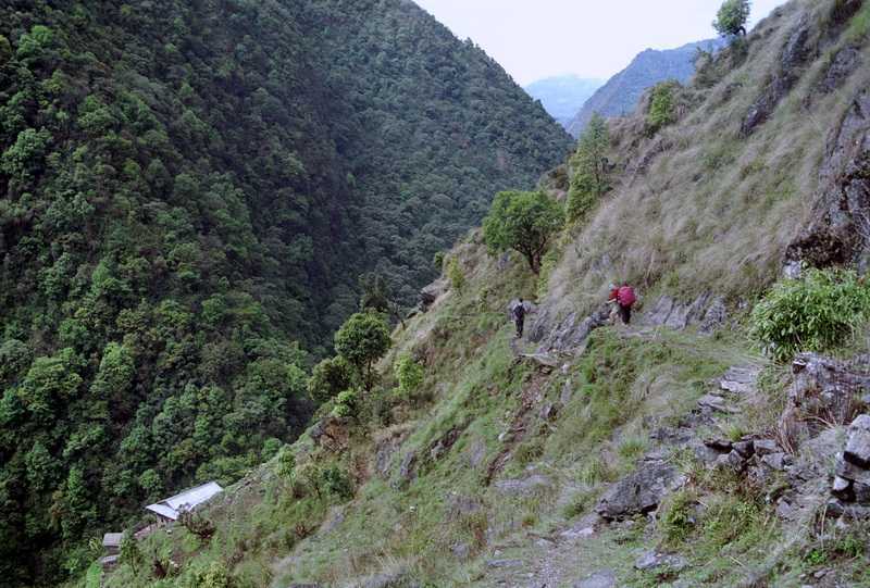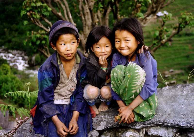 28.04.2003 Ab dem Ramite Pass beginnt ein ausgebauter Weg aus großen Steinen, teilweise aus Baumstämmen, der abwärts über Weiden mit den kleinen Hüttchen von Chittre nach unten führt bis zum malerisch gelegenen Zeltplatz Omje Khola (2360 m), hier auf den Terrassen lunchen wir. Über den Fluss Omje Khola 200 m bergauf über den Dhupi Pass (2520 m), dann ca. 800 m bergab an vielen schönen Grundstücken mit Steinhäusern, Bambusdächern, Terassenfeldern mit Kartoffeln, Korn, Bananen, Gemüse und den großen Kardamom-Pflanzen vorbei bis zum Zusammenfluss von Omje/ Amil und Kabeli, an dem der große Ort Yamphudin (Yak-Pudding) liegt, sehr maoistisch. Es leben viele Menschen hier, teils sehr gut gekleidet, ein Volleyballspiel findet statt. Viele Lodges und Zelte sind zu sehen, unser Zeltplatz liegt am Ortsausgang in Flussnähe in 1700 m Höhe. Marihuana wächst hier wie bei uns die Brennesseln. Gehen gleich im kalten Fluß baden und Wäsche waschen. Für unsere Porter kauft Niru eine große lebende weiße Ziege, die aber nicht lange lebendig bleibt, sondern der sofort der Hals durchschnitten wird. Fell abziehen, am Fluß ausnehmen, zerteilen... Und abends essen auch wir Ziegenbraten und Ziegenleber. Wir kaufen noch 7 Flaschen a 180 ml 60 %igen Nepal-Rum für die Mannschaft dazu und so ist das Festessen perfekt. Der Alkohol muss wieder heimlich besorgt werden, wegen der Maoisten. Abends ist es jetzt wieder angenehm warm, das ewige Frieren ist endlich vorbei, die dicken Klamotten kommen wieder nach unten in die Packsäcke. Abends 1 Std. Regen, danach wolkenlos. Ab hier stellt Niru über Nacht wieder Zeltwachen auf, es soll wohl schon Fälle von Diebstahl gegeben haben.