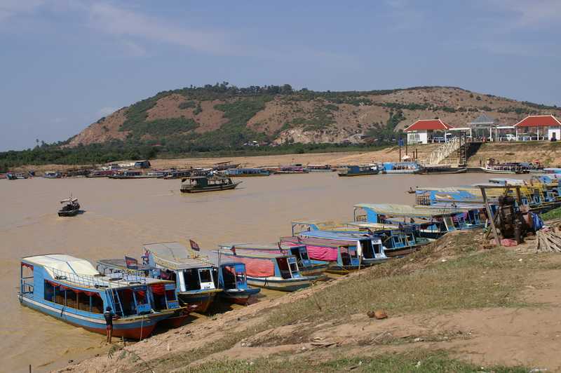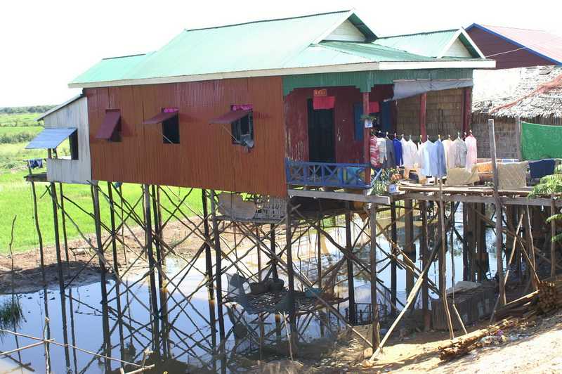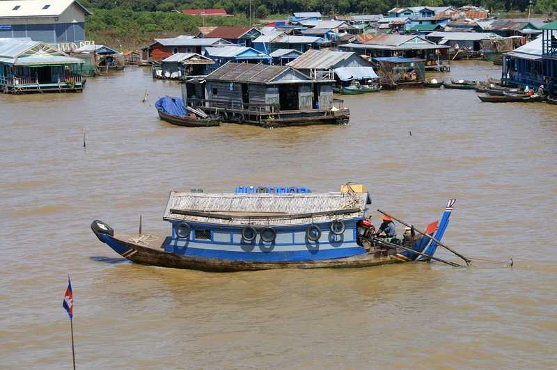 24.01.2010 ...Die Pässe und alle ausgefüllten Unterlagen plus 25 Dollar für das Visum werden eingesammelt, gehen dann von Mann zu Mann, jeder trägt etwas ein, heftet etwas ab oder stempelt darin herum. Zuletzt werden die Namen der Passinhaber lautstark aufgerufen, es kommen dabei lustige Namen heraus. Aber irgendwie kriegt jeder irgendwann seinen eigenen Pass zurück. Draußen herrschen tropische Temperaturen von 32 – 35 Grad, es ist gerade noch angenehm, nicht zu schwül. Wir nehmen uns ein Taxi mit Festpreis nach Siem Reap City, der zweitgrößten Stadt im Lande. Busse gibt es keine, der Flughafen liegt 12 km westlich. Der Fahrer des eisgekühlten Toyota Camry bringt uns ins Angkor Voyage Guesthouse. Nichts besonderes, aber ruhig gelegen und saubere Zimmer. Wir haben Klimaanlage, WC, Bad und Dusche. Im Nachbargrundstück ein Krokodilgehege mit ca. 20 stolzen Exemplaren, man braucht nur aus dem Treppenhaus-Fenster zu ihnen hinein zu hüpfen, sie würden sich freuen. Da wir vom Flug ausgeruht und relaxt sind, holt uns unser Taxifahrer pünktlich 11 Uhr ab zum ersten Ausflug. Wir besuchen die schwimmenden Dörfer am See Tonle Sap. Die Holzhäuser auf dem Festland stehen auf meterhohen wackligen dünnen Holzpfählen. Im Unterschied zu den schwimmenden Behausungen müssen die Bewohner für das Grundstück Pacht bezahlen. Hier ist alles genormt, die Eintrittskarten lösen, die Aufteilung auf die Boote, wir bekommen ein Boot für uns vier allein, nehmen auf Korbstühlen Platz. 5 km fahren wir in dem Flussarm, bis wir zur Mündung in den See kommen. Das Flusswasser steht in der sommerlichen Regenzeit ca. 6 m unter dem Pegel, es ist lehmgelb und trübe, wird später im April seinen niedrigsten Stand erreichen. Im See “stehen“ die schwimmenden Dörfer und Häuser. Auf den schwimmenden Holzinseln oder Pontons befinden sich Wohnhäuser, Schulen, die Kirche, Basketballplätze und eine Gaststätte. Zu dieser werden wir gebracht. Hier weist schon ein Riesenschild darauf hin, dass man doch bitte etwas essen und trinken solle. Ich bestelle getrocknete Babyschlange und kühle Getränke. Die Schlange schmeckt anfangs gut, hinterlässt aber einen süßen ekligen Nachgeschmack. Dafür ist sie teuer, wie auch die anderen Sachen hier. Ich unterhalte mich mit unserem Boots-Guide, auch darüber, dass man Kindern kein Geld geben sollte. Er meint, wir könnten doch etwas für die armen Kinder der schwimmenden Schule spenden. Auf meine Nachfrage zur benachbarten Schule sollen wir bei der geschäftstüchtigen Kellnerin gleich für 25 Dollar ca. 10 bereitliegende Schreibhefte und einige Bleistifte für die “armen“ Schüler hier kaufen. Auf meinen Hinweis, dass ich für dieses Geld in der Stadt einen Zentner dieser Utensilien bekomme, reagiert die beflissene Bedienung süßsauer wie ihre Nudelsuppen. Wir erfahren von unserem Führer, dass der Besitzer dieser schwimmenden Geldinsel in Kalifornien in Saus und Braus lebt. Das dämpft unser Mitleidsgefühl erheblich. Etwas angeknackst werden wir von unseren Bootsführern wieder zum Festland gebracht. Hier erleben wir eine Hochzeit auf kambodschanisch, in einem Riesenzelt mit goldenen Stühlen wird lautstark gefeiert. Eine große plärrende Boxenwand dröhnt über die zahlreichen Festgäste. Wir beschließen den schönen heißen ersten Tag in Kambodscha in einem Nudel-Restaurant im ersten Stock eines Hauses in einer touristischen Einkaufsstraße der Innenstadt. Man wird davor höflich angesprochen und zum Essen eingeladen. In der Stadt gibt es viele Touristen, die sich jetzt in den Gaststätten die Mägen füllen. Wir bekommen Nudelsuppe mit viel Schweinefleisch, Fischsuppe, Fischcurry und Salat mit Nudeln und Hühnchen. An den eigenartigen Geruch der Speisen in Kambodscha können wir uns nur schwer gewöhnen. Bier vom Fass gibt es dazu, der halbe Liter für 50 Cent. Auf der Straße sprechen uns junge Männer nach Sonderwünschen an, Special Lady, Marihuana oder Tuk-Tuk. Beim “Doctor Fish“ kann man seine Käsemauken in ein Wasserbecken hängen und sie von den hungrigen Fischen abknabbern lassen, gegen einen angemessenen Obulus versteht sich.