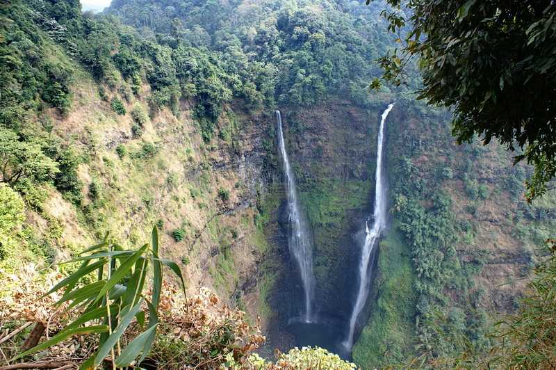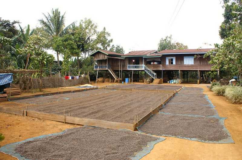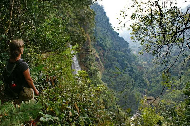 01.02.2010 ... Es gibt noch zwei Wasserfälle in der Nähe. Wir beschließen, uns den Stress der langen Fahrt zu ersparen, fahren mit dem nächsten auf unser Winken hin haltenden Bus auf der Straße 23 zurück zum km 38. Es ist bereits früher Mittag und sehr heiß, als wir auf dem staubigen roten Fahrweg die ausgeschilderten 1,8 km durch weißblühende grüne Kaffeefelder zum Wasserfall Tham Champee wandern. Hier können wir uns im Pool des kleinen breiten Wasserfalls erfrischen, an einem Seil kann man sich auf einem Floß zum Fall vorziehen. Hinter dem Wasserschleier ein großer Felsüberhang. Wir laufen denselben Weg zurück zur Straße, überqueren diese und kommen zum Tad Fane Resort mit dem 200 m tiefen Zwillingswasserfall. Ein rutschiger Pfad führt einen steilen Abhang hinunter, wo wir etwas bessere Sicht auf den gewaltigen Fall haben. Mietzi schmeißt gleich mal ihr Zigarettenetui in die Tiefe. Im gehobeneren Restaurant essen wir Makkaroni und Spaghetti, das Beerlao und die Pineappleshakes mildern etwas den Durst in der Mittagsglut. Vom Tad Fane suchen wir den Weg durch den Urwald zum benachbarten Tad Yueang. Ein Einheimischer gibt uns eine ungefähre Beschreibung. Anfangs geht es bergab zu einem Bach mit Badebecken und kleinem Wasserfall, rechts schimmert der Große durch das Dickicht. Von hier sehr steil, fast senkrecht auf einem abgerutschten bröckelnden Hangstück 30 m hinauf, wir müssen uns regelrecht an den Bäumen hochziehen, dabei poltern einige große Steine auf die Nachfolgenden, zum Glück gibt es zum Schrecken nur blaue Flecke. Auf einem brachliegenden Kaffee-Acker laufen wir hoch und oben den weiterführenden schmalen Pfad in den Dschungel. Unsicher geworden, weil ab und zu weitere Abzweigungen auf dem Pfad kommen, laufen wir über die Bergkämme, zählen etliche Zwischentäler, hoffentlich müssen wir nicht zurück, ein Abstieg über den Hang wäre gefährlich, zumal wir nur leichte Sandalen anhaben. Aber irgendwann hören wir Stimmen und das Rauschen des Tad Yueang. Geschafft und erleichtert erreichen wir das bekannte Gefilde, laufen zu unserem Kaffeehaus zurück. Kurz nach unserer Ankunft treffen vier sportliche Typen auf mit Säcken bepackten Geländemotorrädern ein. Völlig verstaubt nehmen sie Unterkunft in unserem Haus. Das Abendessen, hausgemacht von den Töchtern des Kaffeeplantagen-Besitzers, ist wieder sehr schmackhaft. Wir fragen nach einer Fahrgelegenheit morgen nach Pakxe und weiter nach Norden. Filius Hom sagt uns, dass 9 Uhr an der nahen Straße 23 ein VIP-Bus aus Attopeu nach Vientiane vorbeifährt. Diesen beschließen wir, morgen zu nehmen. Wir wollen als nächstes den Phou Hin Boun Nationalpark besuchen.