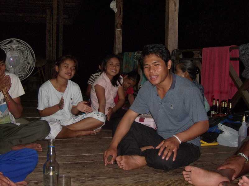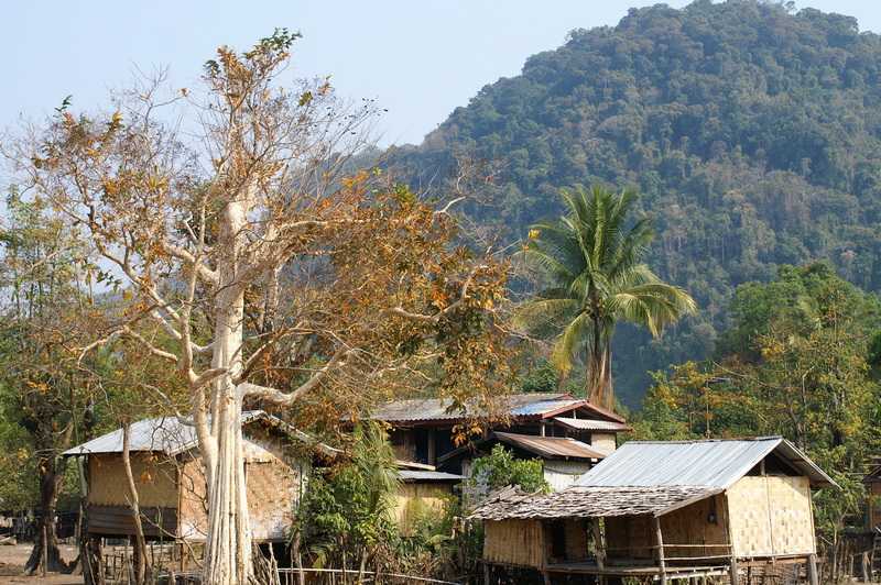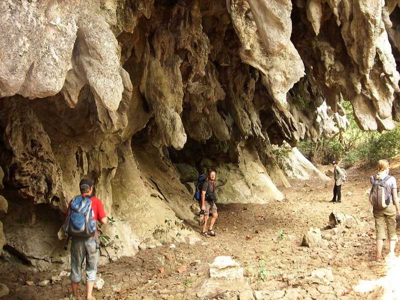 03.02.2010 ... Ein Stück fahren wir auf der Straße 12 nach Osten, dann biegen wir nördlich in einen staubigen Fahrweg ein. Langsam nähern wir uns den gewaltigen steilen grünen Karstbergen, die wie eine Fata Morgana aus der flimmernden Landschaft auftauchen. Auf dem Dach des Tuk-Tuk hat man die beste Sicht. Man muss sich nur gut festhalten. In der Trockenzeit ist der Fernblick durch Dunst und staubige Luftschichten getrübt. Zur Monsunzeit soll die Sicht wesentlich klarer sein, sagt uns der Führer Mr. E. Unsere wenigen Sachen haben wir in Tagesrucksäcken verstaut, die großen Sachen verblieben derweil im Hotel in einem verschlossenen Raum, in den aber jeder mit dem Schlüssel reinkann, wenn er will. Zuerst besuchen wir die Schule im Dorf Ban Phon Dou. Im nächsten Dorf Ban Na treffen wir unsere lokalen Führer, die uns auf verschlungenen Pfaden in die Höhlen der hohen Karstberge führen. In der Regenzeit ist hier fast alles überschwemmt, die Bewohner betreiben dann auch Fischfang. Jetzt aber können wir die vielen kleineren und größeren Rinnsale gut über- oder durchqueren. Es geht heute ohne wesentliche Höhenmeter durch die Landschaft. Oft in ausgetrockneten Flussbetten entlang. Wir treten direkt an einen riesigen Karstberg heran, ja können sogar unter dessen bizarren, metertief ausgezackten überstehenden Rand darunter entlanglaufen. Hier kommen wir zur Tham Khai Nao Höhle, die Sage weiß von einem riesigen Mangobaum, dessen Früchte immer in das Wasser an der Höhle fielen und deshalb die Tiere und Menschen her kamen. Innen bewundern wir dank unserer Stirnlampen viele schöngeformte teils bizarre Kalksteingebilde, die von der Decke und an den Seitenwänden hängen. An manchen Stellen finden wir Spinnennester, dessen langbeinige Bewohner beim Anleuchten auf unser Licht zukrabbeln, sehr zum Entsetzen unserer weiblichen Höhlenbesucher. In einer Kalkspalte entdecke ich einen Spinnengeneral, dessen Hinterleib fast hühnereigroß und ca. 4 cm lang ist, hier kennt die Angst unserer Frauen keine Grenzen mehr. Wir erfahren, dass die Laoten die Spinnen, die es während des Monsuns in Massen gibt, fritieren und dann knabbern, eine Delikatesse, wird mir versichert. Man oder besser Frau schüttelt sich angewidert bei meiner süffisanten Übersetzung. Wieder draußen im Hellen erläutert unser Führer uns die Bedeutung eines naked tree, eines nackten Baumes, dessen Rinde von den Einheimischen bei Magenproblemen als Tee genutzt wird. Andere Bäume werden ausgehöhlt und das darin sich sammelnde flüssige Harz für Lampen zur Beleuchtung verwendet. Unsere Führer haben drei Jahre studiert und in dieser Zeit als Mönch gelebt mit allen Einschränkungen hinsichtlich der weltlichen Dinge einschließlich der Keuschheit, des Entsagens des Abendessens, des Alkohols und des Rauchens. Nach dieser Zeit wurden sie wieder normale weltliche Bürger. Man kann in Laos als gläubiger Buddhist ebenso in der kommunistischen Partei sein, so eng wird das hier nicht gesehen. Am Nam Don Resurgence befindet sich eine riesige, 50 m hohe und mehrere hundert Meter lange Wasserhöhle, durch die ein Wasserlauf fließt. Hier treffen wir andere Touristen, die sich im Wasser tummeln und auf ihr Mittagessen warten. Auch für uns werden frische Fische über dem Feuer geröstet. Gegessen wird mit den Fingern von Plasttellern, die auf frischen grünen Blättern stehen, Klebreis in den typischen geflochtenen runden Etuis ist bei den Mahlzeiten immer dabei. Wir schwimmen noch ein wenig in und vor der Höhle, mit unserem Mr. E paddele ich um die Wette, er gewinnt alle Kategorien. Dann geht es gestärkt weiter durch den heißen Dschungel. In der nächsten Höhle, der Tham Pha Chan Höhle, einer riesigen 50 m hohen und 700 m langen Wasserhöhle gehen wir mit unseren Begleitern gemeinsam schwimmen und nach Durchqueren eines dunklen Ganges kommen wir zur eigentlichen Buddha-Höhle mit Treppenstufen, die zu einem Altar mit zwei mit Goldfarbe bemaltem Buddhastatuen aus Beton führen. Hier stehen viele kleinere Buddhas aus Sandelholz, die von den hierher zum Beten und Feiern pilgernden Dorfbewohnern aufgestellt wurden. Dies gab der Höhle auch ihren Namen. Unser Führer Mr. E erzählt uns, dass früher hier wertvolle Statuen aus Gold und Silber standen, diese aber während der Kriegswirren zwischen Laos und Thailand alle gestohlen wurden. Bei diesen Höhlen-Festen sind viele Menschen anwesend, es werden dabei drei volle Tage und Nächte heilige Zeremonien abgehalten und auch viel Lao Lao getrunken. Wir erreichen eine hohe dünne grauschwarze Stupa, die Muang Phon Stupa, deren Inneres Überreste wichtiger verstorbener Persönlichkeiten birgt. Am Nachmittag erreichen wir unser heutiges Ziel, das ethnische Dorf Phon Tong, in dem wir übernachten werden. Die ca. 20 Häuser sind alle aus Holz und auf Stelzen gebaut. Es gibt einen tiefen Dorfbrunnen, zu dessen Grundwasserspiegel die Frauen an einer überlangen Stange einen kleinen Eimer hinablassen, ihn füllen, hochziehen und in die beiden großen 20-Liter-Plasteimer füllen. Diese werden an die Enden einer biegsamen Bambusstange eingehängt und leichtfüßig in das jeweilige Haus getragen. Wir werden zu einer der größten Hütten geführt, hier dürfen wir ohne Schuhe im ersten Stock unser Domizil, eine große Terrasse mit einem Schlafraum mit Matratzen, Decken und Kopfkissen, sowie Moskitonetzen in Besitz nehmen. Im Haus wird auch für uns auf offenem Feuer gekocht. Aber unser Haus hat schon den Luxus eines Elektromotors, der das Brunnenwasser mittels einer Pumpe direkt zum Haus fördert. Ja es gibt hier sogar schon Strom, wie fast überall in Laos. Hinter dem Haus wurden extra für Touristengruppen ein Betonhäuschen mit Duschkammern und WC gebaut. Duschen kann man, indem man sich mit einem kleinen Schöpfer aus der großen Wassertonne Wasser über den Körper gießt, eine herrliche wohltuende Erfrischung in der schwülen Hitze des Nachmittags. Das Dorf ist mit dem Songtheo zu err