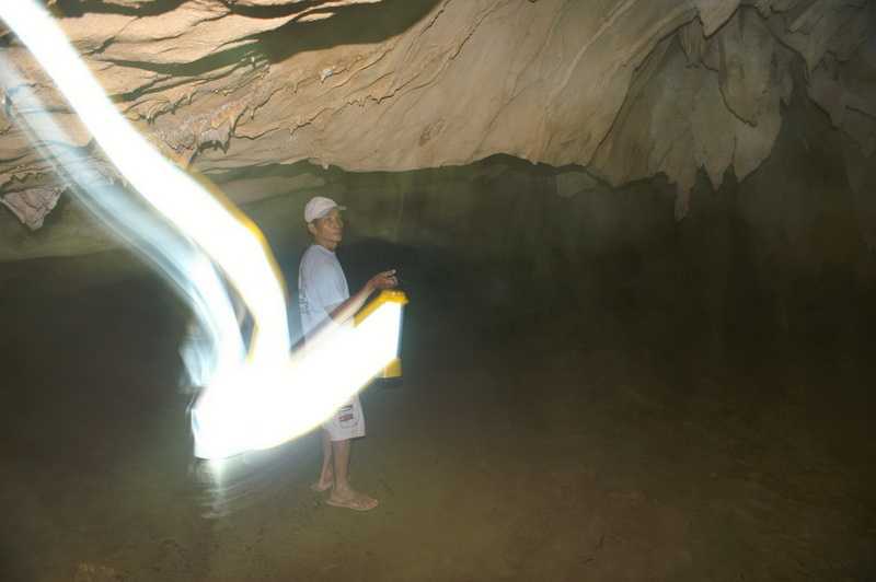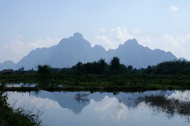 07.02.2010 ... zum Eingang der riesigen Tropfsteinhöhle. Wir kommen ins Schwitzen, auch in der Höhle ist es feuchtschwül. In der spektakulären 200 m langen Eingangshalle befindet sich ein goldener Altar mit einer liegenden Buddha-Statue. Wir versuchen, in den kleinen glasklaren Seen und Tümpeln der weiteren Höhlenräume die Goldene Krabbe zu sehen, haben aber kein Glück. Dafür sehen wir fantastische Kalkgebilde, einen Saurier und viele Stalaktiten. Nach einer Weile rieche ich Rauch wie von ausgeblasenen Kerzen, es ist aber alles stockdunkel. Plötzlich vor uns Geisterstimmen, zwei Jungs und drei Mönche machen sich einen Spaß, die Besucher zu erschrecken. Schnell haben sie die Kerzen wieder angezündet. Sie sitzen auf einer Bastmatte vor einem tiefen Abgrund. Die Höhle ist hier noch längst nicht zu Ende, für die Besucher heißt es aber umkehren. Wieder draußen, ist erst einmal eine Runde planschen in der türkisblauen Lagune angesagt, das Wasser ist schön kühl. Wir fahren mit unseren Rädern ein Stück zurück, verpassen den nahen rechten Abzweig nach Naxom. Weil auf dem Schild Na Some steht, ignoriere ich es. Ein Fehler. So kommt es, dass wir die Runde entgegen der Beschreibung im Reiseführer in Uhrzeigerrichtung machen. Einige km doppelt fahren. Es dauert einige Dörfer und eine ganze Weile auf der breiten staubigen Dorfstraße, bis ich meinen Irrtum bemerke. Auch andere Radler sind wie wir falsch herum gefahren. Nach einer in der Sonnenhitze nötigen Erfrischungspause im Dorf Phonxay / Nady fahren wir dann weiter rechts den schmaleren Weg nach Naxom zurück. Die Richtung ist eigentlich egal, überall stehen die schroffen, mit dichtem Grün bewachsenen Karstberge herum, dazwischen Ebenen und Felder. Einige Flüsse sind zu überqueren oder zu durchwaten, was uns einmal den Brückenzoll erspart. Kurz nach Naxom steht ein schroffer steiler Felsen, an seinem Fuße die Pouna Höhle. Ein nettes älteres Pärchen sitzt davor. Für je 10.000 Kip gehe ich mit Carmen auf Erforschung, der Ehemann kommt als unser Führer mit. Er leitet uns durch die flache, teilweise überflutete Höhle bis tief in den Berg hinein. Er kann etwas englisch und wendet es auch in der Höhle an. Anschließend trinken wir mit ihnen ein Bier und unterhalten uns, Witz und Carmen zeigen von zu Hause mitgebrachte Fotografien. Die Frau fragt uns, wie alt wohl der Weihnachtsmann sei, wir erklären, dass es nur eine Gesichtsmaske ist. Sie erzählt von riesigen Spinnen, die die Menschen fressen. Wir merken, dass sie es im Fernsehen gesehen hat und klären sie darüber auf, dass es keine solch großen Spinnen gibt. Sie ist beruhigt. Die kleinen, für uns großen, die in der Regenzeit massenhaft auf den Feldern vorkommen, werden von ihr als Delikatesse geschätzt, in Laos knabbert man sie fritiert. Erschöpft kommen wir spätnachmittags wieder in Vang Vieng an, geben unsere Räder ab. Dann ist Duschen und Relaxen angesagt. Ich probiere zur Dämmerung eines der gelben Kajaks aus, die unter einem der Bungalows liegen. Ziehe es den Nam Xong ein Stück flussauf und lasse mich dann mit den Stromschnellen hinunter treiben und paddel in den Kehrwassern wieder aufwärts. Zum Abendessen gehen wir fein aus in das gehobene La Veranda-Restaurant des Hotels Villa Namsong. Wir nehmen unter dichten beleuchteten Palmen Platz. Die Kellner hier sind sehr freundlich. Die Speisen á la französisch sehr gediegen, auch die Frappés und anderen Getränke samt Pastis schmecken vorzüglich. Schließlich bezahlen wir 352.000 Kip oder 41 Dollar für alles. Für morgen reserviere ich für Mietzi und mich eine kombinierte Höhlen- und Kajaktour.