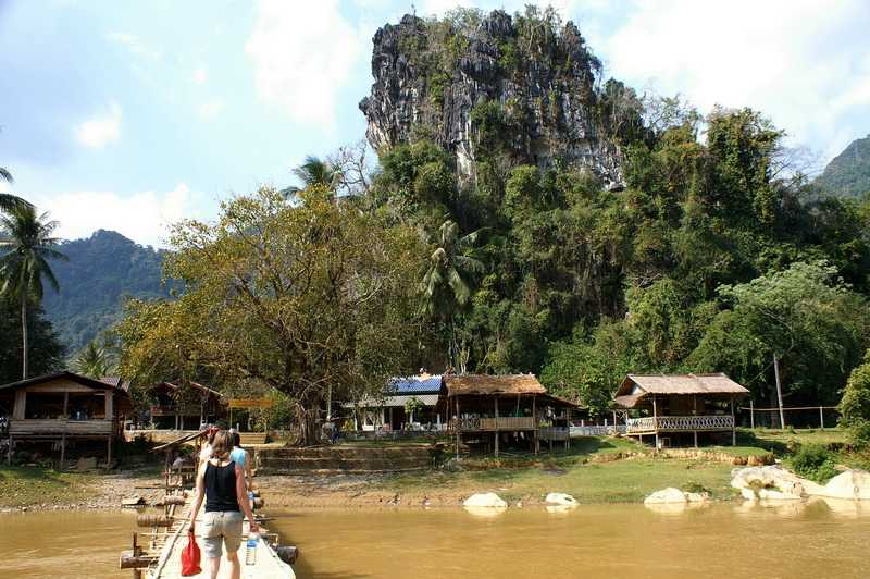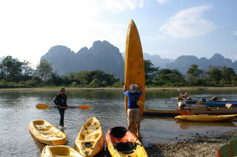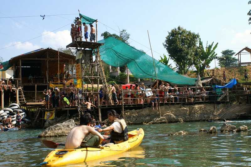 08.02.2010 ... Und dass es in Laos über 60 verschiedene ethnische Völkergruppen gibt, die alle eine eigene Sprache sprechen. Dass die Felder jetzt nicht mehr mit Kühen, sondern mit Traktoren bearbeitet werden. Dass es in diesem Gebiet früher Abertausende wilde Elefanten gab. Laos ist auch bekannt als das Land der Millionen Elefanten, als Lane Xang. Von diesen sanften Riesen gibt es aber nur noch ca. 1600, davon arbeiten 560 im Wald in der Holzindustrie. Auf Dämmen laufen wir über grüne Reisfelder einige Minuten zur nächsten Höhle, der Tham Nam, der Wasserhöhle. Der Wasserstand in ihr wird durch ein Wehr künstlich reguliert. Alle bekommen eine wasserdichte 12-V-Batterie umgehangen, die mit einer vorsintflutlichen Stirnlampe verbunden ist und einen ausreichenden Lichtschein verbreitet. Ich habe meine eigene sehr helle Stirnlampe dabei. Fotokamera und Wertsachen sind wasserdicht verpackt und umgehängt. In LKW-Schläuchen, sogenannten Tubes, paddeln wir an einer Leine durch den niedrigen Eingang in die Höhle hinein und dringen ca. 400 m in ihr Inneres vor. Zwischendurch steigen wir an flachen Stellen aus und ziehen unsere Tuben durch das flache warme Wasser. Es gibt Abzweigungen und Zuflüsse im Berginneren. Beim allmählichen Dahintreiben kann man die Kalkgebilde an Decke und Wänden der Tropfsteinhöhle durch die Stirnlampe angestrahlt betrachten. Schließlich pfeift uns unser Führer wieder zurück, umkehren. Wenn man weiter vordringt, gelangt man irgendwann ans andere Höhlenende auf der anderen Bergseite. Vor unserem Lunch ist noch etwas schwimmen oder ausruhen angesagt. Wir bekommen gebratenen Gemüsereis mit 2 Hühnchen-Ananas-Fleischspießen. Minibananen zum Nachtisch. Zurück zum Tuk-Tuk werden wir etwas näher an Vang Vieng herangefahren. Am Ufer des Nam Xong werden wir kurz in die Handhabung der Doppelpaddel eingewiesen, dann legen wir ab. Die knallgelben Polyäthylen-Boote made in Vietnam für 2 Personen haben keinen Innenraum, sondern sind ringsum geschlossen. Der Sitz und die Vertiefung für die Füße sind in die obere Bootshaut eingearbeitet. Sehr kenterfreundlich. Da der Xong Niedrigwasser hat, brauchen wir eigentlich nur Steinen ausweichen und flache Stellen meiden. Wir gleiten auf dem schnellen Wasser dahin, an hohen Bergen und kleinen Dörfern vorbei. Nach einiger Zeit hören wir von weitem ein seltsames rhythmisches leises Wummern, das sich nach einigen weiteren Kilometern als eine riesige Freilichtdisko mit Strandvergnügungen herausstellt. Wie die Loveparade meint Mietzi. Die Neustadt von Vang Vieng ist erreicht. Hunderte Jugendliche drängen sich vor den laut scheppernden gräßlich übersteuerten Boxentürmen oder lassen sich von allen möglichen Holzkonstruktionen und kranähnlichen Geräten ins Wasser fallen. Eine Riesenparty wird hier gefeiert. Überall gibt es Bars mit special foods und happy drinks zu überhöhten Preisen. Jede Bar versucht, den Nachbarn in der Lautstärke und der Höhe der Ausleger mit den Bungee-Seilen zu übertreffen. Auch unsere kleine Flotte hält an einer der etwas weniger besuchten Bars, man erwartet von den Besuchern, dass sie etwas konsumieren. Auch hier klopft der Tekkno im Takt seine hässlichen Bässe in die wunderschöne Dschungellandschaft. Wem es zu heiß wird, der springt einfach ins Wasser. Wenn er Glück hat, taucht er wieder auf. Viele lassen sich hier in den Tubes den Nam Xong hinab treiben, unterwegs werden sie von findigen Wirten mit Wurfleinen an die Ufer der Bars gezogen, auf dass sie dort etwas trinken. Nach 3 km endet das Tubing an einem Schild am Ortsanfang von Vang Vieng. Auch wir landen etwas später kurz vor unserer Holzbrücke links an und verlassen unsere Boote. Ich hätte mir eine etwas längere und vor allem ruhige Kajaktour gewünscht. Kurz vor unserem Ziel kommt uns ein kleines Motorboot entgegen, Witz und Carmen strahlen uns daraus entgegen, die sich ebenfalls die Landschaft vom Wasser aus ansehen. Gemeinsam gehen wir noch einmal vor unseren Bungalows im Xong River baden, genießen direkt am Ufer den malerischen glühenden Sonnenuntergang hinter den verschiedenen Schattierungen der Karstberge. Wir sehen plötzlich riesige keilförmig fliegende “Zugvögelschwärme“ aus den Bergen aufsteigen. Eine sympathische Amerikanerin mit Feldstecher klärt uns über dieses nach ihren Aussagen “amazing“ Phänomen auf. Es sind nämlich keine Vögel, sondern Tausende von Fledermäusen, die aus ihren Schlafhöhlen ausschwärmen und sich in der anbrechenden Dunkelheit auf die Jagd nach Insekten machen. Inzwischen ist es stockdunkel. Für morgen reserviere ich Plätze in einem VIP-Bus 10 bis 15 Uhr für die 227 km lange Fahrt nach Luang Prabang. Eigentlich wollten wir gerade diese landschaftlich einmalig schöne Strecke mit einem Leihwagen oder einem Privat-Bus zurücklegen. 125 Dollar für das kurze Stück sind uns aber dann doch zu teuer.