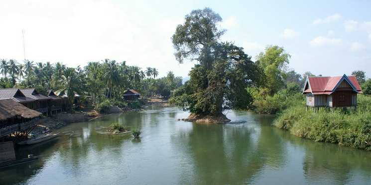 Temperatur ca. 35 Grad. Nach dem Frühstück mit Baguettes, Butter, Marmelade und echtem Lao-Kaffee, stark und leicht ölig mit dicker süßer Kondensmilch am Boden erkunden wir unsere Insel Don Det zu Fuß. In 25 Minuten erreichen wir vorbei an vielen Unterkünften und Restaurants, später durch den Dschungel mit Stelzensiedlungen und einem Köhler die alte von den Franzosen in den 50er Jahren gebaute Eisenbahnbrücke über einen Mekongseitenarm, überqueren sie zur Insel Don Khon. Wir müssen hier ein Permit für den Besuch der Insel erwerben, darin sind alle Eintritte für Wasserfälle usw. enthalten. ½ Std. laufen wir zum Wasserfall Somphamit, sehen uns vorher eine alte zusammengerostete Lokomotive und einige Webstühle in den Hütten an. Da jetzt Trockenzeit herrscht, ist die Durchflussmenge des Mekong in diesem engen tiefen Felsental nicht ganz so gewaltig wie zur Regenzeit, ...