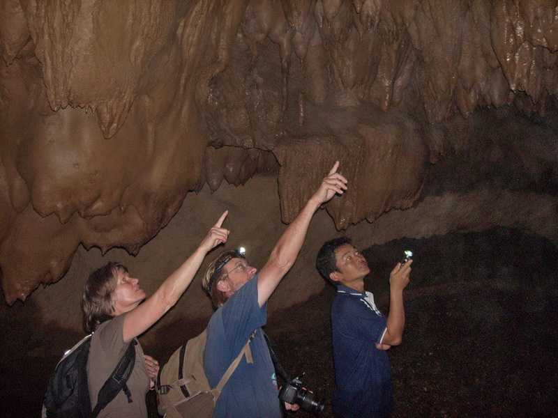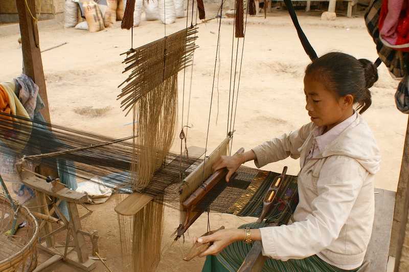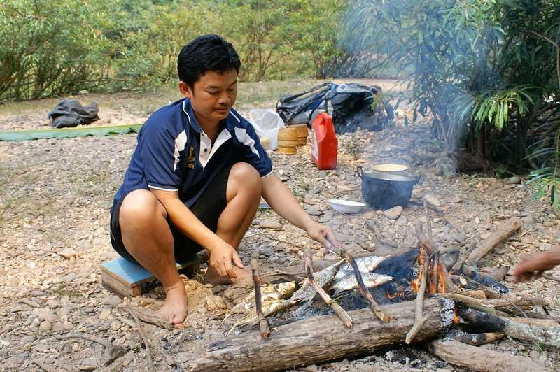 17.02.2010 ... Als das Netz komplett ausgeworfen ist, verankern wir das Boot. Dann beginnen die Fischer mit dem Einholen des Netzes, Ich helfe tatkräftig mit. Mit ins Wasser geworfenen Steinen versuchen wir, die Fische in Richtung Netz zu treiben. Im Netz blinkert etwas, 10 Fische von ca. 20-25 cm Größe haben sich verfangen, sie werden aus dem Netz gepuhlt, mit einem Holz getötet und ins Boot geworfen. Eine glibberige Angelegenheit. Unser Mittagessen. Beim zweiten Fangversuch zappelt kein einziger Fisch im Netz. Jetzt wird der Motor im Heck gestartet und es geht in voller Fahrt stromauf. Der Bootsführer sitzt im Bug an der Bootsspitze, es wird mit einer überlangen Bambusstange gelenkt, die hinten am Steuerruder befestigt ist. Gas gegeben wird mit einem Strick, der durch das gesamte Boot führt. Das Wasser des Flusses ist dunkelgrün und glasklar, die steilen Berge sind bis 1700 m hoch. In der Regenzeit ist der Wasserspiegel ca. 4 m höher, die Farbe des Wassers dann lehmgelb. Nach 45 Minuten Fahrt verlassen wir die Karstberge in ein liebliches flaches Tal. Wir legen an einem Khmmu-Dorf an, Ban Hat Sphi. Wir laufen an einem Berghang hinüber zu dem Tai Deang-Dorf Sopvan, einem Weberdorf. Hier werden feinste Stoffe von Hand auf kleinen Webstühlen gewebt. Am kleinen Flüsschen, der am Dorf vorbei fließt, sind winzige Generatoren angeschlossen, die jeweils eine Glühlampe mit Strom versorgen können. Wir kaufen einige der preiswert angebotenen Schals, daran webt eine Frau ungefähr eine Woche, er kostet umgerechnet etwa 4-6 Euro, ein Tagesverdienst für diese Frau von einem Euro. Unser Führer Saang, was soviel wie Elefant heißt, hat hier ein Grundstück gekauft und wird sich demnächst ein Haus hier bauen. Kurz nach dem Dorf legen wir an einer Höhle an, laufen 300 m in das Innere, sehen Fledermäuse, Stalagtiten und goldene Metalleinschlüsse an Decke und Wänden. Wenn man weitergehen würde, könnte man die Höhle mit einigen Hindernissen komplett durchqueren und käme auf der anderen Seite des Berges wieder ans Tageslicht. Wir bekommen langsam Hunger, an einer Sandbank legen wir an. Hier werden wir unser Mittag zubereiten und essen. Zuerst wird ein Feuer entfacht, trockenes Holz ist schnell gefunden. Die Fische werden ausgenommen, die kleineren halbiert und für eine Suppe mit Flusswasser, saurem Klee und Salz in einen Kochtopf gelegt und dieser über die Flammen zum Kochen aufgestellt. 5 Minuten gekocht. Die großen Fische werden dann seitlich mehrmals eingeschnitten, mit Salz eingerieben, der Länge nach mit einem flachen angespitzten Bambusstab durchgestochen, damit sie stabil bleiben und nicht zerfallen. Ein Stock wird bis auf ein Ende gespalten, die Fische dazwischen geklemmt und die beiden Enden des Stockes mit einer Liane zusammengewickelt. Das ganze kommt über die bereits entstandenen glühenden Holzstückchen zum rösten. Ab und zu wenden. Bananenblätter als Tischtuch. Es dauert nicht lange und wir können zulangen, wie immer essen wir mit den Händen, die Rechte wird dabei bevorzugt. Zum Fisch gibt es Klebreis und Chilli-Schoten. Frisch vom Feld mitgebrachte Süßkartoffeln werden ebenfalls in der Glut gebacken, geschält und als Dessert verzehrt, sie schmecken leicht süß und sehr mehlig. Am frühen Nachmittag sind wir in Muang Ngoi zurück. Saang setzt gleich unser Trinkgeld in Beerlao um. Wir erkunden auf einem Rundgang den Ort, besichtigen zwei verschiedene Tempel und die große Schule. In einem der Tempel sind Mönche beim Lernen zu sehen. Zum Sonnenuntergang 17 Uhr 15 hinter den Bergen sitzen wir direkt über dem Hafen des Fischerdorfes in einer kleinen hölzernen Aussichtsgaststätte, sehen den Frauen beim Baden und Waschen zu. Sowie den Bemühungen, viele verschiedene Waren hoch ins Dorf zu bringen. Meist tragen Frauen die schweren Sachen hoch, darunter Bierkästen, verladen sie auf Karren und diese werden dann zu den einzelnen Häusern geschoben. |