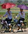 07. 02. Wir frühstücken außer Haus in einer kleinen einheimischen Kneipe. Dann leihen wir uns Fahrräder aus für eine 36 km lange Radtour nach Westen zwischen die Karstberge zu einigen Höhlen. Zuerst überqueren wir gegen einen geringen Obulus die Holzbrücke über den Nam Xong. Am Rande der Brücke stecken mahnend zwei amerikanische Landminen-Bomben. Nach einigen km auf der leicht welligen Staubpiste kommen wir zum türkisfarbenen Pool im Gelände an der Höhle Tham Kham, Goldkrabbenhöhle. Wir buchen zusammen mit einer 30-jährigen hübschen Finnin eine geführte Tour für 5 Personen. Bekommen, wer keine hat, große Stirnlampen verpasst und folgen unseren beiden schweigsamen jungen Führern 50 Höhenmeter felswandaufwärts ...