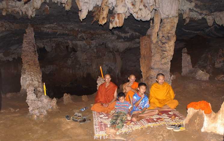08. 02. 9 Uhr 30 werden Mietzi und ich von einem Tuk-Tuk aufgepickt. 10 Touristen nehmen an unserer Tour teil. Unsere Sachen haben wir in wasserdichte mitgebrachte Ortlieb-Packsäcke verstaut. Zuerst fahren wir 14 km in nördlicher Richtung ans Ufer des Flusses Nam Xong, laufen über eine schmale Holzbrücke durch das ethnische 20-Familien-Elefantendorf Ban Tham Xang zu einer Höhle, der Elefanten- oder Buddhahöhle Tham Xang. In der Höhle steht rechts ein Mini-Elefant aus Stein. Die Höhle stellt in ihrer Gesamtheit ebenfalls den Körper eines Elefanten dar, in dem wir uns bewegen, wenn wir durch die Höhle laufen. Am Eingang hängt ein makaberer Gong aus der Spitze einer amerikanischen Fliegerbombe. Innen ein riesiger Fußabdruck Buddhas. Unser Führer erläutert uns sehr ausführlich alles Wissenswerte über Laos, das Dorf und die Höhle.