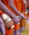 19. 02. Der unvermeidlich letzte Tag und Morgen in Laos bricht an. Es ist sehr kühl, gestern Abend regnete es leicht. Ein guter Tag zum Abschied nehmen. Wir frühstücken in dem französischen Restaurant Aux Jardins de L’Elefant. Deponieren unsere Rucksäcke im Hotel und unternehmen einen letzten Rundgang durch die Gassen der liebenswerten Metropole. Am Mekong in einer kleinen Freiluftkneipe ein letztes Beerlao, ein letzter Pineapple-Shake. 13 Uhr holt uns der bestellte Tuk-Tuk-Fahrer ab und bringt uns in 15 min. zum kleinen Flughafen Luang Prabangs. Gleich beim Betreten des Gebäudes werden wir und unser Gepäck flüchtig durchleuchtet. Das war schon der Sicherheitscheck. Wir checken unsere Rucksäcke nach Frankfurt durch. Unsere 70-sitzige chinesische Propellermaschine ATR-72 der Bangkok Airways erhebt sich 15:40 und landet nach zweistündigem Flug in Bangkok. Hier haben wir eine Menge Zeit, die wir auf dem weitläufigem Flughafen teils liegend verbringen. Fast um Mitternacht startet unsere große Boeing 747-400 der Thai Airways und landet nach 12 Stunden ruhigem Flug mit 160 km/h Gegenwind am nächsten Morgen in Frankfurt. Das Essen und die Getränke in beiden Maschinen sind wieder vom Feinsten.