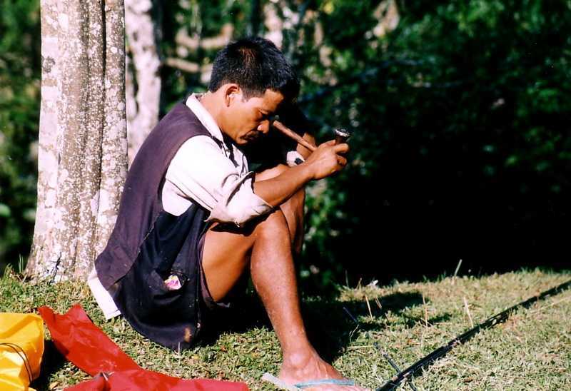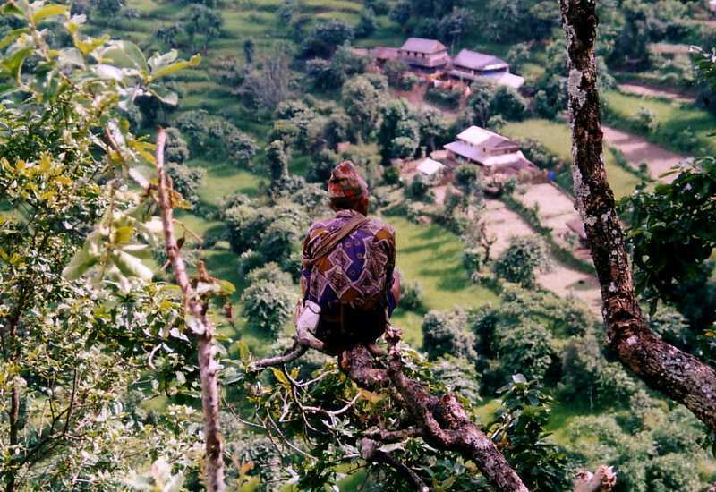 04.10.2004 ... Mich packt die Wut beim Anblick dieser arroganten Gestalten, denen man ihre Gesinnung schon von weitem ansieht. Die Zelte werden weit oberhalb des Ortes auf einem schmalen Acker errichtet. Da wir mehrere Herren mit Einzelzeltwunsch haben, sind die Plätze für unser Lager durch die Größe beschränkt, und wir müssen immer neue Plätze begutachten. Die Träger kommen durch ihre schweren Lasten erst weit nach Dunkelheit an und wir helfen beim Zeltaufbau mit unseren Stirnlampen. 20:00 sind wir fertig. Dunkel wird es punkt 18:00. Zum Abendessen gibt es Momos, das sind gefüllte Teigtaschen, Farfalle, das sind geflügelte Spaghettis, Kürbisgemüse, Bratkartoffeln, Suppe und dünne Shrimps-Chips. 22:30 ist der Tag heut für uns zu Ende. Vorher melden sich noch der Lehrer und der Bürgermeister des Ortes bei uns und bieten ihre Hilfe an, falls uns die Maoisten belästigen sollten. Wir erfahren, daß sich vergangene Nacht zwei angeworbene Träger aus Gorkha mit ihrem Vorschuß aus dem Staub gemacht haben, das bedeutet, daß die Lasten der beiden aufgeteilt werden müssen auf die anderen Träger. + 1150 / - 460 m in 9 Std.
