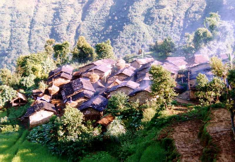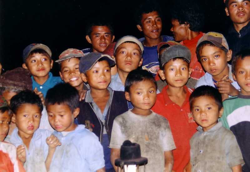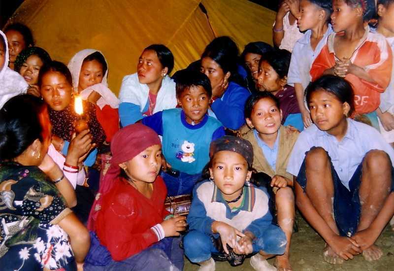 06.10.2004 ...Manche müssen einzeln vom Lehrer in ihre Klassenzimmer zum Unterricht gerufen werden. In den Pausen haben wir Gelegenheit mit einigen zu sprechen, viele verstehen und lernen Englisch. Vor allem Gerald hat große Mühe, all der Kinder Herr zu werden. Ich verbinde meine von den Litschis, einer ganz gemeinen Blutegelart Nepals, geplagten und angeknabberten Füße, am Ende der Regenperiode werde ich 86 Bisse zählen. Inzwischen wollen uns Barpaks Maoisten erneut abkassieren, wir zeigen ihnen unser Tax Bill von Kharchok und sagen ihnen, daß nun Schluß mit Zahlen ist, irgendwie scheinen sie zu begreifen ... 16:00 geht es erst weiter, weil die Träger auf den glatten, steilen Wegen nicht gut vorankommen, vorbei an riesigen Hirsefeldern, soweit das Auge reicht. 17:00 beginnt ein ungemütlich werdender Regen. Unter einem Wasserfall hindurch geht es bis auf 2020m Höhe nach Bhuwa Kharka, zu einem schlammigen Weideplatz, der nur so von Litschis wimmelt. Als bekannt wird, wir werden hier nächtigen, sinkt allen das Herz in die durchweichten Schuhe. Es regnet weiter ununterbrochen, es ist stockdunkel, die Träger noch sonstwieweit hinten. Wir sitzen oder stehen, jeder mit Stirnlampe schwer beschäftigt, seine Schuhe und Füße unter Kontrolle zu halten und der Millionen Litschis Herr zu werden, was aber meist nicht gelingt. Peter sein Leatherman und sein Feuerzeug sind eine kleine Hilfe in der großen Not. Die Küchenleute und unsere Führer, sowie die Träger haben keine Zeit, sich um Litschis zu kümmern, sie müssen sehen, daß die Zelte aufgebaut, Wasser geholt und unser Essen gekocht und die Trek-Säcke in die Zelte geräumt werden. Beim Einräumen läßt sich´s nicht vermeiden, einige Litschis mit ins Zelt holen. Wir beschließen, diesen Abend das Dinner in den Schlafzelten einzunehmen. Wie können unsere nepalesischen Freunde inmitten von Milliarden blutrünstiger Sauger schlafen...? Am Morgen erfahren wir, sie sind alle in Zelten untergekommen, ein kleiner Trost, trotzdem entzünden sich später bei Einigen die vielen Bisse. Zwei Küchenhelfer haben schwere Verbrühungen an Armen und Beinen erlitten. In kurzer Zeit ist unser Verbandmaterial restlos aufgebraucht, zum Glück verstehen Mietzi und Peter II was vom Verarzten, ein Küchenhelfer wird trotzdem später zurückgeschickt, er hat schwere eitrige Verbrühungen am Arm und Fieber. Rückblickend stellen wir fest, daß es bisher jeden Tag mehr oder weniger geregnet hat und dies für den Oktober hier ungewöhnlich ist. Später sagen uns alte Leute aus Sama, daß es erst zwei mal in ihrem Leben in dieser Zeit soviel Regen und weiter oben viel Schnee gegeben hätte. Gebietsweise werden die unreifen Getreidefelder vom hohen Schnee plattgedrückt und damit nicht verwendbar für die Bauern. Abends und nachts Starkregen, an einer Stelle tröpfelt es ins Zelt.