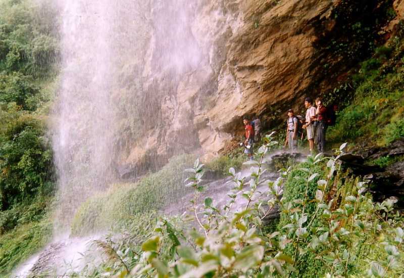 07.10.2004 ...Über die reißenden Flüsse führen teilweise abenteuerliche Brücken aus Holz, teilweise mit Steinen belegt und alle sehr rutschig. 11:00 Lunch auf 2200m, danach endlich bergauf bis zu einem grasigen Berghang, diesen steil aufwärts bis auf 2920m und links wieder abwärts bis auf 2825m zu einer schönen Yakalm Tiliche Kharka mit kleinem Holzhäuschen, das gleich als Küche und als Unterstand bei Regen, der jetzt wieder einsetzt, genutzt wird. Einige Holzteile der Hütte wandern stillschweigend in das Lagerfeuer, das angezündet wurde, um alle zu wärmen und um den Trägern den Weg zu weisen. Diese kommen mit ihren viel zu schweren Lasten erst spät in der Dunkelheit an, total fertig, bis auf die Knochen ausgepowert, einige fallen um wie tot, einer zittert wie Espenlaub. Wir helfen beim Zeltaufbau im Dunkeln. Es ist 20:00. Es regnet ununterbrochen. Jeder versucht, sich irgendwie nützlich zu machen, irgendwie kann ich mein schlechtes Gewissen den Trägern gegenüber nicht unterdrücken... Die armen Kerle tun mir einfach leid. Waschen im kleinen Bach... als ich meine Socken auswringe, färbt eine rote Spur der zerquetschten Litschis das Wasser. Nach dem Abendbrot in der Almhütte gehe ich nochmal ins Toilettenzelt, während der Papierbenutzung geht ein tagheller gleißender Blitz mit fast gleichzeitigem gewaltig lauten Donner direkt neben dem Zelt nieder, ich denke nur an die langen Alu-Stäbe des Klozeltes und war noch nie in meinem Leben so schnell aus einem Zelt geflüchtet... Nachts ist es ca. 5°C und Dauerregen.