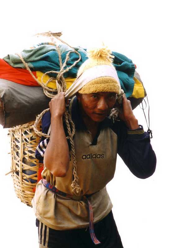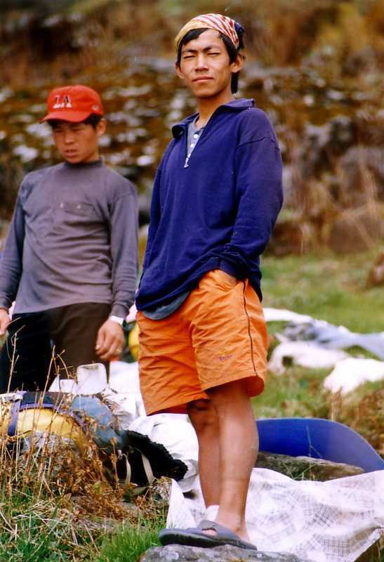 08.10.2004 ...wir aber gehen geradeaus weiter bis in einen Talschluß. Auf dem Weg hatte es eine Brücke weggerissen und wir müssen durchs eisige Bachwasser, bzw. über einen 10 cm schmalen, 10 m langen glitschigen Holzbalken ans andere Ufer balancieren. Mir sterben fast die Beine ab, auch mit den Balancierern ging alles gut, unsere Führer Pasang und Phadindra waren ins Wasser gestiegen, um den Balken zu befestigen und um uns zu sichern. Das Rupina La Base Camp (3710m) wird inmitten von riesigem Felsgeblöck, umtost von Gebirgsbächen, aufgeschlagen. Es ist kaum als Camp auszumachen, Pasang hat ein gutes Gespür gehabt. Normalerweise wollen wir an diesem Tag noch hoch zum High Camp, dieses ist aber vor Anbruch der Dunkelheit nicht mehr erreichbar. Kurz vor dem Camp sehen wir einen Schneeleoparden durch die Felsen am Ufer des Flusses huschen, eine Seltenheit. 18:00 schnell geholfen beim Zeltaufbau und schon gibt´s heiße Milch und Tee, kurz darauf können wir unsere gemütlichen 2-3 Mann-Zelte beziehen. Vorher nochmal Litschi-Kontrolle, die Biester begleiten uns bis hier auf 3710m Höhe. Auch heute wieder Regen ab dem Lunch, bis er 19:00 in leichten Schneeregen übergeht. Kurz vor Erreichen des Rupina La Base Camp ertappe ich mich bei leichten Kopfschmerzen und leichter Übelkeit, diese verfliegen in der Ruhephase. Beim Abendessen ist wieder alles ok. Durch das viele Trinken muß ich nachts immer zweimal pinkeln. Es gibt jetzt die berühmte Knoblauchsuppe in allen Varianten und zu allen Mahlzeiten, sie ist ein Geheimrezept gegen Höhenkrankheit.