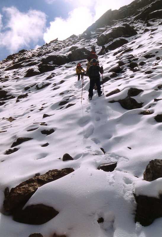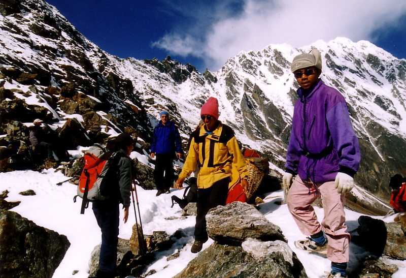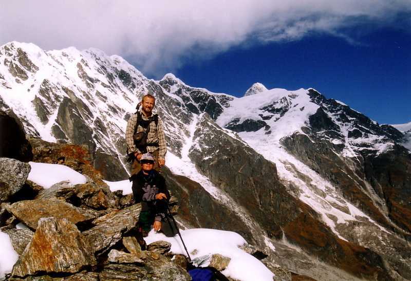 10.10.2004 ...Oben sehr gute Sicht auf die Berggipfel der anderen Seite: v. li. Boudha Himal (6672m), Himal Chuli (7893m) mit West Peak (li. davon, 7540m) und Rani Peak (6693m), im Norden der Kutang Himal (6238m). Alle fallen sich um den Hals und drücken sich, eine Foto-Orgie wird abgehalten. Danach Abstieg über feste Schneefelder zwischen großen Felsblöcken, weiter unten durchsetzt mit niedrigen Wacholderbüschen. Wir erreichen ein herrliches, märchenhaft schönes Tal, das Chhulung-Tal, durchflossen von einem Gletscherbach, umgeben von Sechstausendern, links der Rupina-Gletscher mit seinen beiden Moränen. Das Tal wie eins in Schottland. Weit unten wird in 3740m unser Lager errichtet, Bhery Kharka/Gletscher Camp. Alle sind froh und stolz, diese erste Bewährungsprobe gemeistert zu haben. Roland hatte große Probleme mit der Höhe, ist sehr langsam gegangen, hat aber alles gepackt. Vor dem Dinner sind noch 3h Ruhe angesagt. Gegen Abend zieht es sich wieder zu. Nachts Regen.