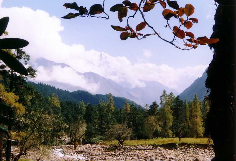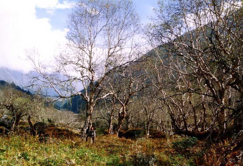 11.10.2004 ...Alle sind happy, Gerald träumt von einem Lunchpaket mit Schnitten für unterwegs, er kann sich nicht an die 1,5 bis 2h Mittagspause gewöhnen. Diese Zeit wird benötigt, daß die Träger wieder Zeit aufholen können, da sie sich ihr Dhal-Bhat selbst kochen müssen und auch längere Pausenzeiten zur körperlichen Erholung brauchen. Nach dem Lunch geht es 100m steil im Wald hoch hinauf auf die Gletschermoräne und auf den Chhulung-Gletscher. Dieser ist hier ca. 1km breit und ziemlich verzweigt, es kostet einige Mühe, einen Weg für alle zu finden über das Geröll und Eis. Nach dem Abstieg auf der anderen Seite wird auf einer saftigen grünen Schafweide zwischen dicken Bäumen und hohem Gras unser Camp aufgestellt, kurz vor Guwap Kharka (3270m). Das Duschzelt wird errichtet und erstmals bekommt der Possible wieder Wasser zu Gesicht, eine lang entbehrte Freude für alle. Den drei in ärmliche Fetzen gehüllten Schafhirten fallen bald die Augen raus, als wir vom Gletscher herabsteigen, auch die Schafe schauen ganz belämmert... Touristen sind hier eine Seltenheit. Später sitzen wir im Speisezelt, es ist schön warm drin, dank der Gasleuchte. Wir spüren, daß es auch nachts erstmals wieder warm ist. Der ganze Tag war wolkenverhangen, es fällt aber kein Regen.