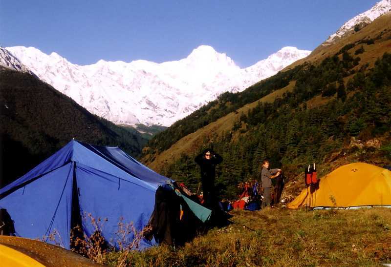 | 12.10.2004 ...Die Wege sind schlammig bis ultramatschig und glitschig, am Anfang in einer Höhe verlaufend, später ca. 700m auf einer Bergwiese inmitten von Schafen steil nach unten führend zur Dujima Kharka (2675m) und uns das Letzte an Kraft und Balance abfordernd. Die Klamotten sind bei den meisten fast durch, fast alle Ausrüstung naß, die Stimmung ist am Tiefpunkt angelangt. Sogar unsere Guides waren verzweifelt: die Regenwahrscheinlichkeit lag bei 250 %. Wie durch ein Wunder hörte abends kurz vor Aufkommen der vollständigen Depression der Regen auf, irgend ein Gott dieser heiligen Berge hatte ein Einsehen mit uns. Die Nacht war sternenklar.