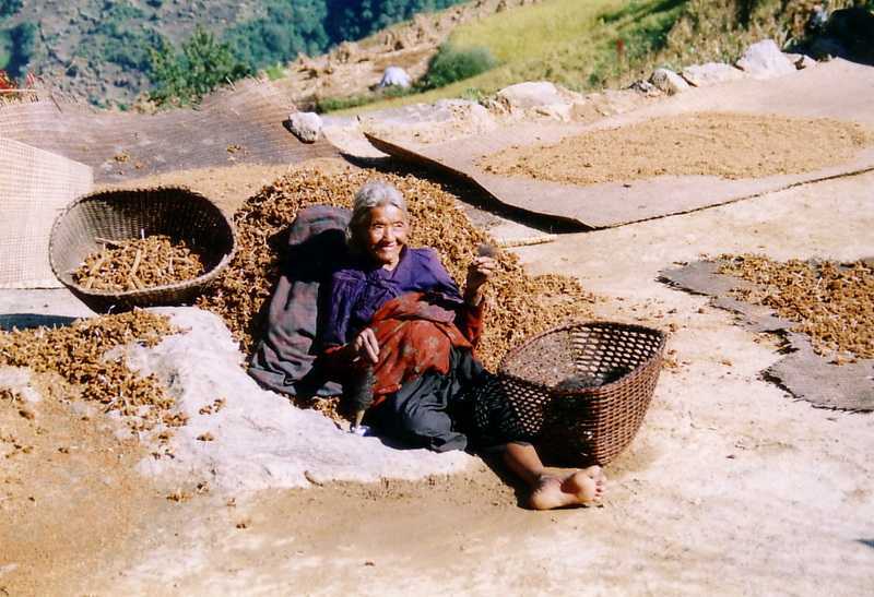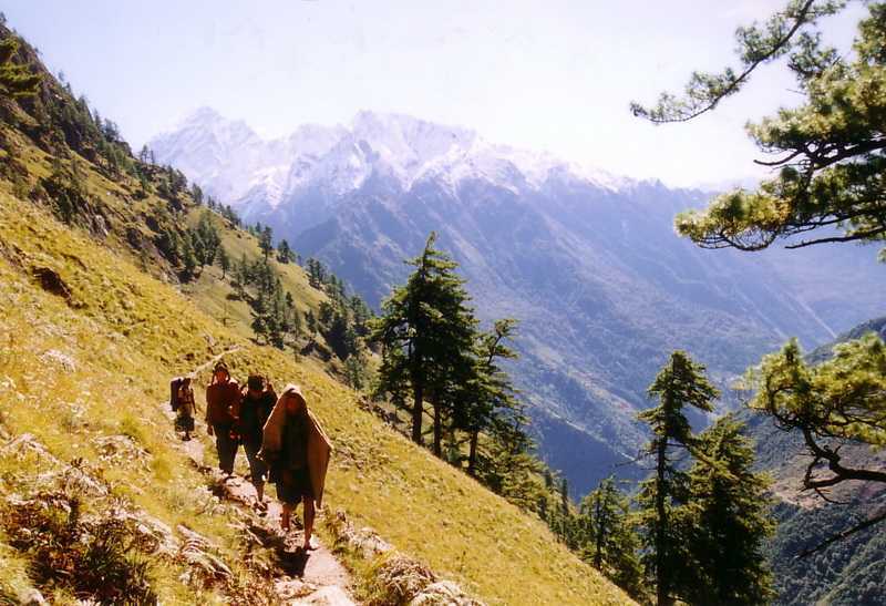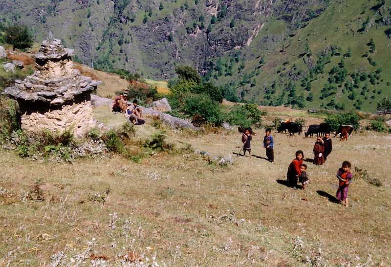 13.10.2004 ...Ein letzter Blick zurück auf Himal Chuli, Rani Peak (6693m) und Boudha Himal. Im neuen Tal werden wir begrüßt von links Lapuchin (5960m) und dem Dwijen Himal (5521m), über dem Siyar Khola Tal geradeaus thront das Shringi Himal (7187m), rechts über dem Budhi Gandaki Tal die Namenlosen des Lumbo Himal (4835m). 400m den Berg hinab nach Nyak (2340m), einer malerischen tibetischen Siedlung aus holzschindelgedeckten Häusern, wo unser Lunch auf einer sonnigen Aussichtsterrasse zubereitet wird. Hier vergessen wir schnell die letzten verregneten Erinnerungen und können uns nicht satt sehen an der wunderbaren, glasklaren Bergsicht. Hinunter geht´s auf steilem Bergpfad bis an den Hauptweg am Budhi Gandaki Fluß zu einer kleinen Hütte mit Zeltwiese namens Pewa (1730m). Von hier leicht bergan auf breitem Fußweg, der jetzt auch öfter von Einheimischen und Touristen begangen wird nach Deng oder Dyang (1860m), einem tibetischen Ort mit 6 Häusern und einem schönen Zeltplatz im Gelände einer Lodge mit Blick auf die herrlichen Berge. Das Wetter ist bis abends wolkenlos und die Stimmung bestens. Wir erfahren, daß der Larkya La Paß zur Zeit zugeschneit und deshalb unpassierbar ist, daß drei Touristengruppen im Vorcamp festsitzen. Wir aber spielen erstmal Karten und lassen uns den berühmten Apple Brandy schmecken.
