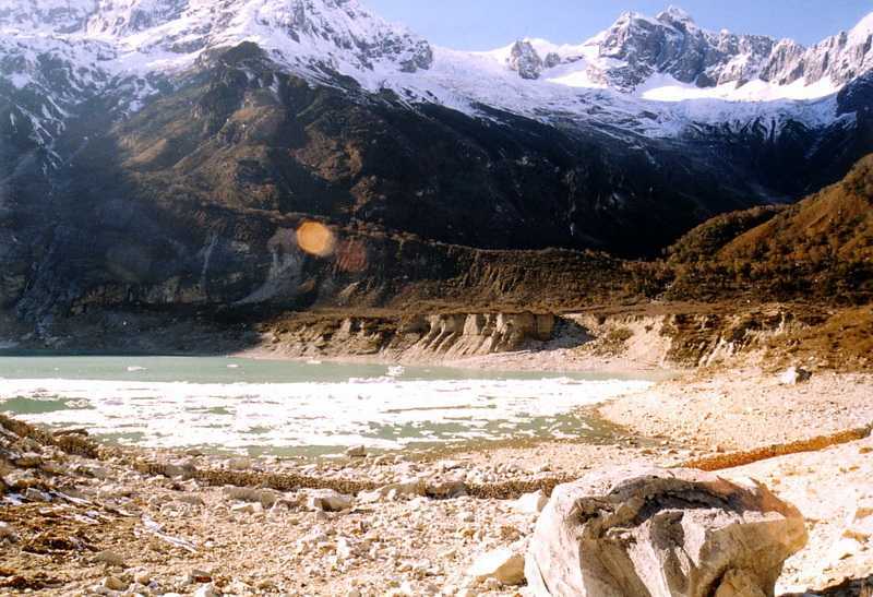 17.10.2004 ...Unsere Zelte werden im Gelände einer Lodge aufgebaut, es ist herrlicher Sonnenschein, alle sind happy, Peter ist wieder voll ok., ein schöner Tag mit gutem Bergrundblick. Vor dem Lunch sortieren und beschriften wir noch die Medizin aus Phadindras Umhängetasche. Mit Zeichensprache werden dabei zur Freude Aller die möglichen Beschwerden dargestellt. Danach werden die vereiterten Litschi-Bisse an Pasang´s Füßen verbunden. Es folgt ein Rundgang durch den Ort, Holger bringt einer armen Familie Geld und Grüße von Julia und Ingmar, diese waren vor einem halben Jahr hier, als das zu früh Geborene der Frau ein Monat alt und sehr schwach war, sie halfen ihr mit Medizin und Geld, sodaß sie vier Monate nach Tibet in ein Krankenhaus gehen konnte. Das Baby und seine Mutter sind jetzt wohlgenährt und gesund. Der Vater überreicht uns Schals, bringt uns am Abschiedsmorgen eine Kanne Buttertee zum Frühstück. 15:30 geht für uns die Sonne unter und sofort wird es extrem kalt. Bei den Nachbarn bekommen wir ein warmes Plätzchen am Herd und eine Kanne Buttertee, 50 Rupies zeugen vom Geschäftssinn der Frau. Nachts lesen wir minus 12°C an unserer Uhr ab. Der morgige Tag ist ein Akklimatisationstag.