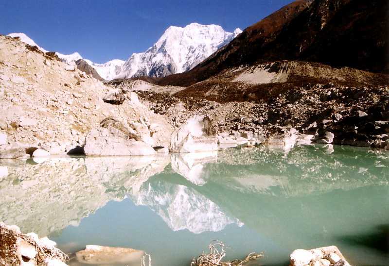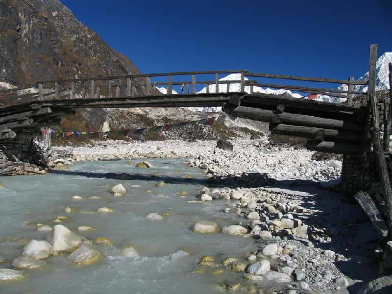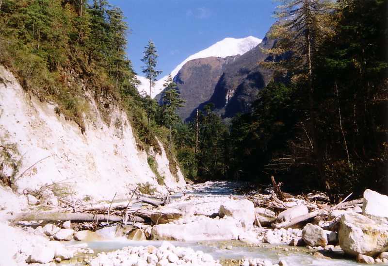 21.10.2004 ...Yak-Karawanen ziehen an uns vorbei, die Yaks und die Reitpferde der Hirten bunt geschmückt. Der Manaslu ist nach sieben Tagen, die er uns begleitet hat, von uns gegangen und hat sich hinter den hohen Hügeln der Umgebung versteckt, zum Trost winkt uns noch die Rückseite des Larkya Peak (6249m) zu. Weiter bergabwärts rechts des Milchfluß führt uns der schmale, kaum von Touristen begangene Weg über die Brücke des Surki Khola vorbei an den Sommeralmen Surki, Karche und Goa, teilweise direkt am Fluß an mehreren frischen Bergrutschen vorbei bis in die große Gurung-Siedlung Tilije auf 2200m. Gedanken darf man sich an so einem Landslice genannten Abrutsch keine machen, sonst kann man gleich umkehren, was aber schlecht möglich ist. Wir campen auf dem engen Grundstück einer Lodge inmitten vieler Blumen. Abendessen im Freien an einem quadratischen Holztisch, es ist wieder warm geworden nach den langen kalten Dinners oben in den Bergen. Endlich kein Frost mehr, dafür beglücken uns vereinzelt Wolken, Halbmond. Es gibt guten Rakshi mit Apfelkuchen, der Milchfluß rauscht und Yakglocken bimmeln, der Abend ist schön. Die höheren Nachttemperaturen wiegen uns in einen entspannten Schlaf.