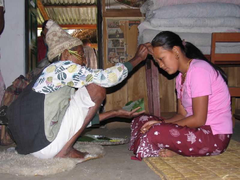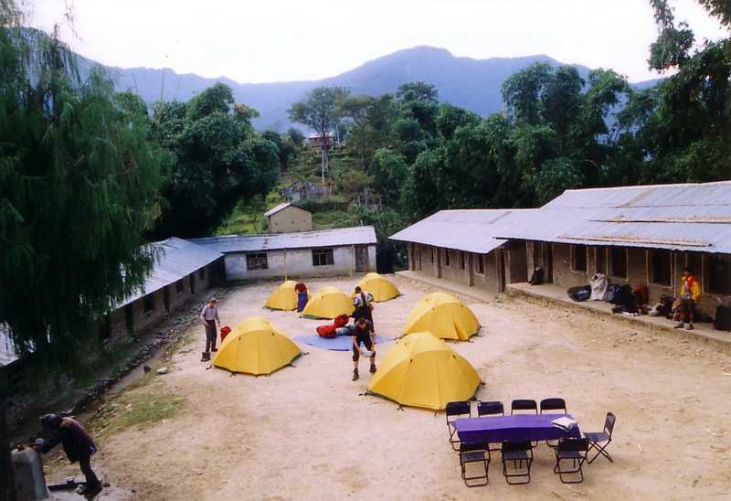 23.10.2004 ...Es ist schön warm draußen und ich vermisse meine verlorenen Tevas, habe für 100 Rupies ein paar nepalesische rutschfeste Schlappen gekauft und bin einen Tag damit gelaufen, es geht, muß mich aber zu sehr auf den Boden und die Steine konzentrieren. Nach weiteren straffen 3h durch mehrere Dörfer wird die Landschaft merklich flacher. Die Berge werden zu kleinen Hügeln. Es gibt viele Reis- und Hirsefelder, Bananen- und Apfelsinenbäume. Zuletzt nochmal steil 150 m hoch nach Bahundanda (1310m), einem Dorf auf einem Bergrücken. Heute ist der Hauptfeiertag des Dhasain-Festes, alle Leute laufen im Sonntagsstaat herum und haben auf der Stirn rote (Buddhisten) oder weiße Reiskörner (Hindus) kleben. Wir sitzen auf einer Terrasse und beobachten wie ein weißes Huhn vom Hahn verfolgt wird. Es flüchtet sich in meine Obhut und wird von mir gestreichelt. Unsere Zelte werden im Hof der Schule aufgeschlagen, da gerade Ferien sind. Der Lehrer des Ortes bringt uns ein Buch mit vielen Touristensprüchen, und wir tragen uns ein mit einer Spende von 1.500 Rupies für einen Schulneubau.