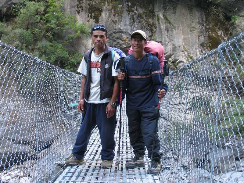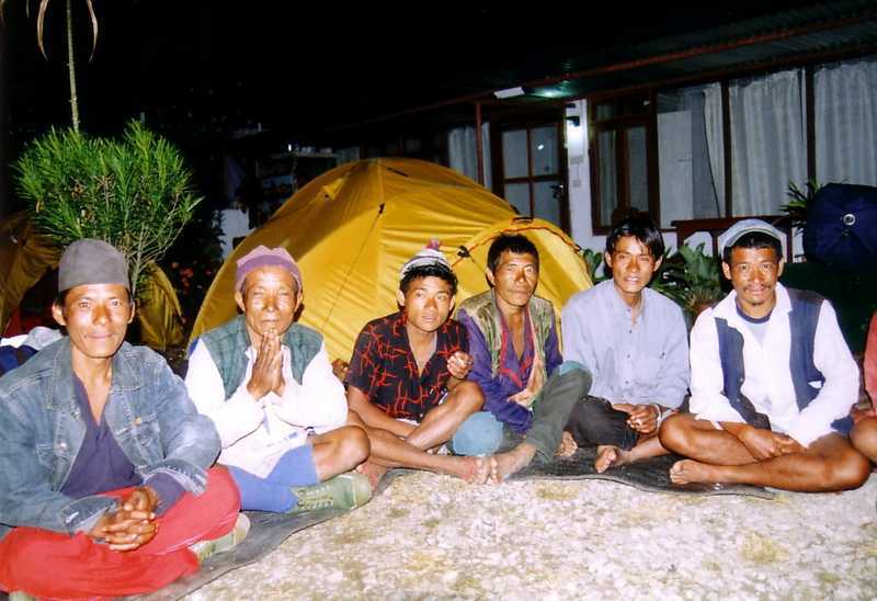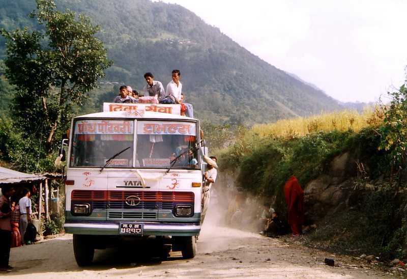 24.10.2004 ...Ab Sera beginnt eine 45-minütige Busfahrt, die mir noch lange in Erinnerung bleiben wird: Peter, Mietzi und ich beschliessen, auf dem Dach mitzufahren, es befinden sich 25 Personen und das gesamte Gepäck unserer Tour auf dem Dach des Busses. Da die Straße nur ein holpriger Weg ist, denken wir jeden Moment, der Bus kippt um, so sehr schaukelt er hin und her. Eigentlich ist die Strecke nur für Jeeps geeignet, sie führt durch Flüsse, über große Steinbrocken und durch tiefe schlammige Fahrrinnen, wir befinden uns aber auf einem vollbeladenen indischen Tata-Bus. Später sehen wir einige abgestürzte und umgekippte Busse. Laufend müssen wir in Deckung gehen, weil tiefhängende Stromleitungen die Straße kreuzen. Ein Abenteuer für sich, daß ich nicht wiederholen werde. Kreidebleich erreichen wir Besisahar (760m), ein schönes Städtchen mit ca. 25.000 Einwohnern, welches zur Zeit wieder in Königshand ist, in jüngster Vergangenheit aber Schauplatz unrühmlicher Maoistenkämfe war. Im Hof des Hotels errichten die Guides unsere Zelte. Abends nehmen wir schweigend Abschied von unseren letzten 13 Trägern, Singen ist verboten, draußen pocht die Armee ans Tor, weil hier der Ausnahmezustand herrscht und die Soldaten panische Angst vor Anschlägen der Maoisten haben. Wir bedanken uns herzlich bei den Trägern, Holger hält eine kleine Ansprache und wir übergeben allen ihre wohlverdienten Trinkgelder. Sie bedanken sich und nehmen ihrerseits Abschied von uns, in der Küche gibt es noch ein großes Eßgelage für sie. Am nächsten Tag werden sie in ihre Heimat zurückkehren, einige sicher einen neuen Job als Träger finden...