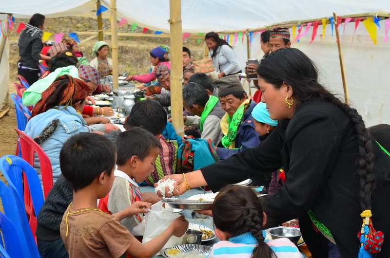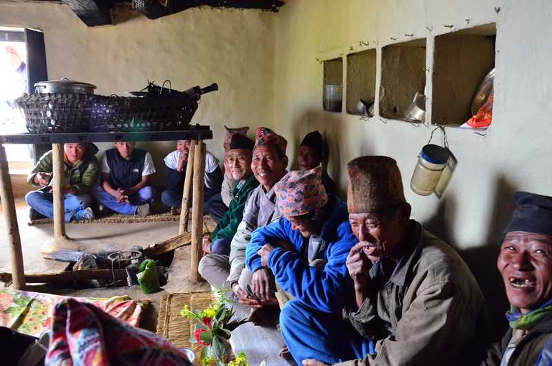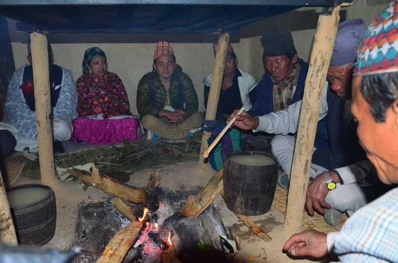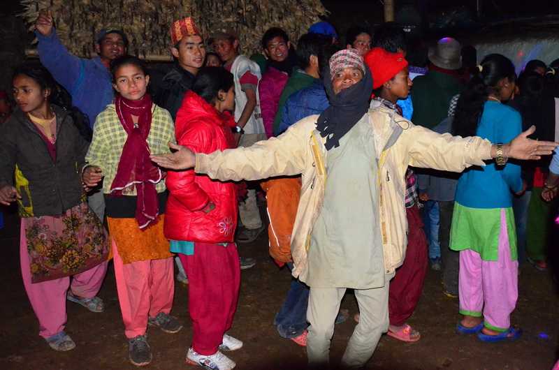 07. 03. 2014 ...Wir folgen gegen Mittag einer Einladung Phadindras in sein Haus. Werden wieder köstlich bewirtet mit geistigen Getränken und Reis mit gebratenem Hühnchen, frisch für uns geschlachtet. Abends finden sich viele Verwandte, Nachbarn, Freunde und Dorfbewohner aus Basa und den umliegenden Dörfern ein. Sie gratulieren alle dem Brautpaar, warten geduldig, bis sie zu Essen und Rakshi zu trinken bekommen. Es geht alles ruhig und ohne Hektik ab. Dann beginnt eine fröhliche Tanzparty mit lauter Musik vom Stick und Verstärker mit nepalesisch aufgepoppten Liedern wie Slowly Slowly oder englischen Tanzhits wie Barby Girl. Um Mitternacht gehe ich ins Zelt schlafen, die laute Party und der Tanz aber gehen weiter bis früh um 3 Uhr. Marie kommt um viertel nach drei ins Zelt gekrochen, sie hat heute ausgiebig mitgefeiert. |