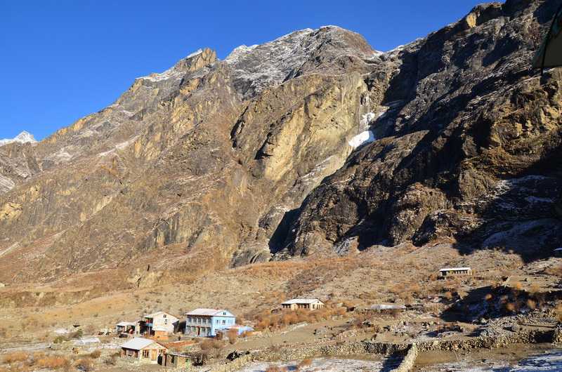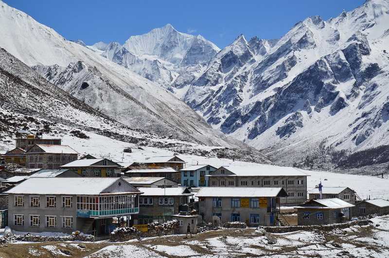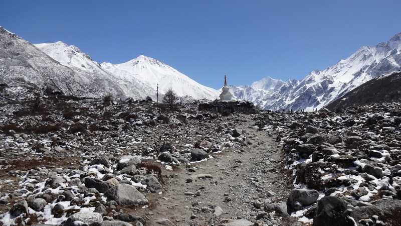 20. 03. 2014 ...Wir kommen vorbei an langen mit gravierten Steinplatten bedeckten Mani-Mauern und zu einer von grauen Steinplatten umkränzten Stupa. Der Sage nach soll sie von selbst aus der Tiefe der Erde emporgestiegen sein und eine Form haben, die so nicht von Menschen erschaffen worden sein kann. Wir passieren ein riesiges Geröllfeld, wo vor Jahren ein Dorf mit seinen Bewohnern unter einer Gerölllawine begraben wurde. Der letzte bewohnte Ort im Langtang Tal heißt Kyanjing oder Kyanjing Gompa und überrascht mich etwas. Es stehen hier viele moderne mehrstöckige Häuser, meist große Lodges. Wir steuern die vereinbarte Lodge mit den auffallend hellgrün getönten neuen Fenstern an, das Hotel Himalayan Paradise. Ein junges tibetisches Ehepaar sind die Besitzer der erst seit letzten Oktober eröffneten Lodge. Der sympathische Tashi Tsering Tamang (sein tibetischer Familienname ist wieder angepasst) ist auch Bergführer und kennt sich in den benachbarten hohen Schneegipfeln bestens aus. Mit Phadindra besuche ich das nahe alte Kloster. Die kleine Käsefabrik ist saisonbedingt geschlossen, wir können ein Stück Yakkäse bei einer geschäftstüchtigen Tibeterin erwerben. Die vier bekannten Israelis kommen leider direkt in unsere Lodge und wir beobachten, wie sie professionell und unverschämt brutal die Preise für Übernachtung und Dhal Bhat bei der jungen Wirtin runterhandeln. Diese scheint das aber schon gewohnt zu sein. Dann bieten sie uns ihren mitgebrachten Tee an, den sie vor der Lodge gekocht haben. Im Aufenthaltsraum ist es nicht sehr warm, da beim Heizen gespart wird und hier oben das Holz teuer ist und extra aus den tieferen Waldgebieten hochgetragen werden muss. So wie auch all die anderen Gegenstände in Haus und Hof sowie alle Lebensmittel. +495 m / -60 m in 3:00 Std. (0:30 Std. Pause) |