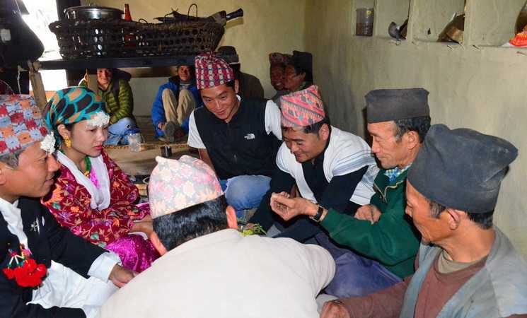 07. 03. Basa. Heute finden unter der Leitung von älteren erfahrenen Männern, auch Shamanen, verschiedenste Zeremonien mit dem Brautpaar im Haus und im Freien statt. Die Dorfältesten kennen die alten Texte, Bräuche und Abläufe, ergänzen sich auch einmal gegenseitig und wechseln sich ab. Geduldig lässt das Brautpaar alles über sich ergehen. Auch für sie ist dies alles Neuland. Meist müssen die Teilnehmer bei den Ritualen Rakshi und Chyang zu sich nehmen.