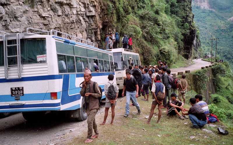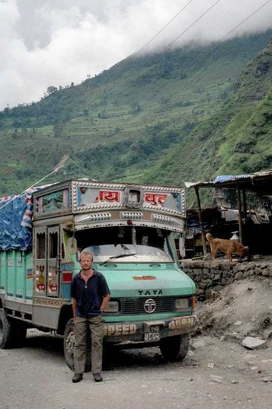 13.09.2001 Wir fahren auf endlosen Serpentinen die Bergtäler auf und ab meist in einer Höhe zwischen 700 und 1500 m, vorbei an vielen Reis- und Gemüsefeldern, es gibt etliche Erdrutsche und Steinschlagstellen an den sehr steilen Hängen. Wir sehen unterwegs viele ärmlichen Hütten und Verschläge. Irgendwann ist die Fahrt zu Ende, der Hang mit der Straße in der Tiefe verschwunden, Endstation für unseren Nobelbus. In langen Schlangen warten Lastkraftwagen geduldig auf die Weiterfahrt. Von jedem Reisenden werden 700 Rupies eingesammelt für den Transport des schweren Gepäcks über die Geröllhänge, uns kommt das etwas viel vor. Als wir aussteigen, umringen uns hunderte Nepalesen und strahlen uns an, berühren uns und jeder will sich etwas Geld verdienen. Es entbrennt eine heftige Schlacht um unsere Rucksäcke auf dem Dach des Busses, jeder versucht, ein Gepäckstück zu ergattern, auch einige Frauen sind hier als Trägerinnen. Sie verrichten meist auch sonst die schwersten Arbeiten, schleppen schwere Steine oder den Kies aus den Flussbetten hoch, während die Männer die eher leichteren Tätigkeiten übernehmen oder sogar neben ihnen hergehen ohne Last. Nachdem glücklich alles auf den Rücken der Träger verstaut ist, laufen wir los über den Abbruch, jeder hat dabei sein Gepäckstück im Auge. Ein einsamer Bagger versucht, den riesenhaften Bergrutsch zu beseitigen, es sieht so aus, als ob das noch Monate dauern würde. Nach 3 km Klettern über die von herabstürzenden Geröllmassen verschüttete Straße steht auf der anderen Seite ein neuer Bus für uns bereit, der uns bis zur nächsten Abbruchstelle fährt, die aber so aussieht, als wenn sie seit Jahren nicht oder sogar noch nie von Fahrzeugen befahren wurde. Es kommen wieder neue Träger, die von unserem Führer einen Zettel für das Gepäck bekommen, vielleicht für späteren Lohn. Die Straße ist jetzt extrem steil, schmal und geröllig mit tiefen Fluss-Furten, Schlammlöchern und immer neuen frischen Berghangabstürzen. Endlich erreichen wir in einem LKW, die Frauen vorn beim Fahrer und die Männer hinten auf der Plattform, den nepalesischen Grenzort Kodari. Wir essen Mittag und unser Führer regelt inzwischen die Zollformalitäten, wir müssen jeder eine nepalesische Zählkarte ausfüllen. Dann endlich laufen wir im Regen über die berühmte „Brücke der Freundschaft“ zum ersten Posten, Ausweise, Gruppenvisum (auf unserem steht noch der kanadische Zahnarzt mit drauf), der LKW mit unseren Rucksäcken kommt nach. Alle steigen wieder ein und wir fahren noch ein kleines Stück, am Anfang dicht zwischen den Häusern von Kodari. Bald kommt ein Hang von 100 Höhenmetern, den wir gemeinsam mit den Gepäckträgern erklimmen müssen. Oben erwarten uns im beginnenden Platzregen Jeeps, die uns erstmal bis zwei km vor Zhangmu, dem tibetischen Grenzort, bringen. Ein Soldatenposten stoppt uns, erzählt wirres Zeug von einer Bombe oder einem bevorstehenden Steinschlag, es blickt keiner richtig durch. Endlich geht´s weiter nach Zhangmu (2300 m) zur Zollgrenzkontrolle mit sehr vielen chinesischen Beamten. Unser Gepäck wird komplett durchleuchtet, wir füllen die Zählkarten für China aus, aller drei Meter ist Passkontrolle, mehrmals, immer schön in einer Reihe aufstellen und immer lächeln, auch wenn es uns sehr schwer fällt bei diesen arroganten Lackaffen in pieksauberer, akkurat gebügelter dunkelgrüner Uniform mit den weißen Handschuhen. Auch einige „unauffällige“ Chinesen in grauem oder hellbraunem Anzug stehen herum, irgendwie erinnert uns das an früher in der DDR. Endlich dürfen wir ins erste Hotel nach der Grenze links, in das Hotel Frobel, ein Riesenhaus mit spartanischen Vierbettzimmern ohne Wasser, aber mit Waschschüsseln. Die Toiletten sind im Keller zwei Stockwerke tiefer, ein penetranter Gestank empfängt uns an den Hockklos ohne Zwischenwände und ohne Türen. Aber wir sind in Tibet und stellen uns schnell auf die neuen Gepflogenheiten ein. Wir müssen jetzt noch Geld umtauschen für unsere Tibetreise, auf der Straße vor dem Hotel erwarten uns ca. 50 Geldtauscher, ich suche mir den vertrauenserweckendsten heraus, bitte ihn in die Lobby des Hotels, wo ihn der aufgeregte Hoteldiener mehrmals hinauswerfen will, nach meinem Zureden, das er mein Gast sei, darf er sich mit uns an den Tisch setzen und in Ruhe tauschen wir 200 $ = 460 DM in 1.620 chinesische Yuan für Mietzi und mich um, 1 US-$ = 2,30 DM, 1 US-$ = 8,10 Yuan und 1 DM = 3,50 Yuan. Inzwischen ist es draußen dunkel geworden, sodass es für einen Fotorundgang leider nicht mehr reicht. Abendessen gehen wir in ein benachbartes Restaurant, auf meine höfliche Frage nach Hund und Katze auf der Speisekarte werde ich von der entrüsteten Kellnerin nicht mehr bedient, man wäre ein anständiges Lokal, so bestellen meine Mitreisenden für mich mit.