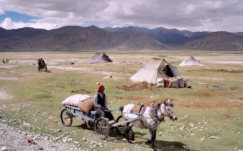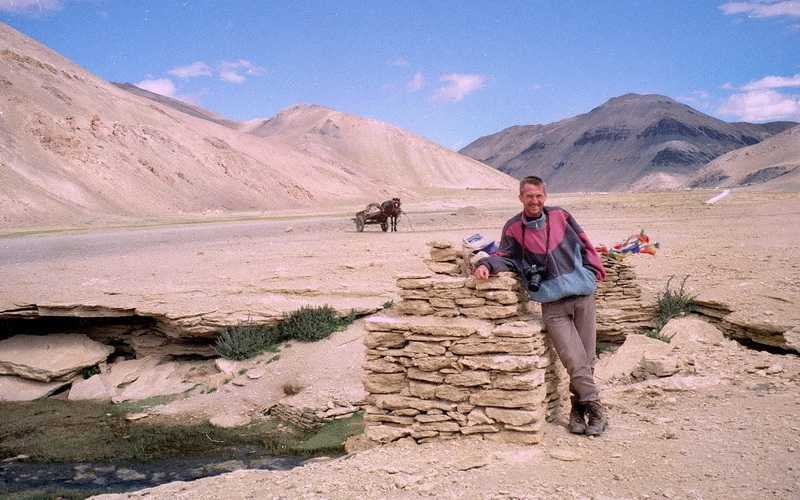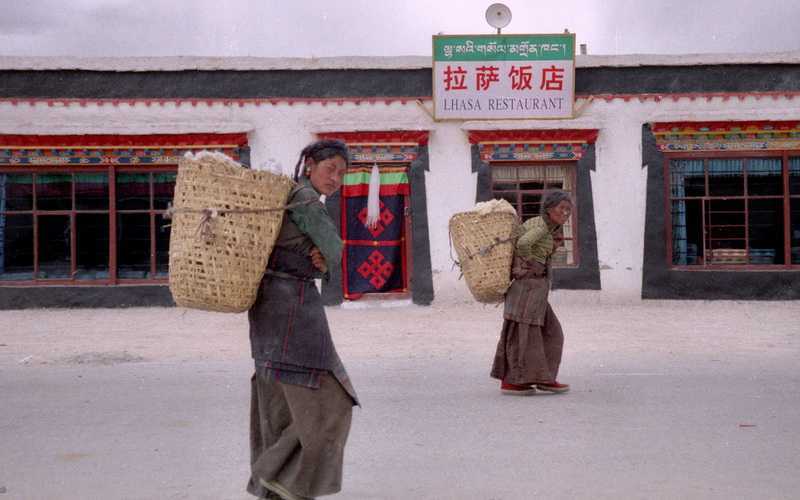 14.09.2001 Kurz nach der Abfahrt ein riesiger Bergrutsch, an der eine ameisenhafte Baubrigade versucht, mühsam die Lücke zu schließen, hier wird schon Beton verwendet. Die Fahrer kommen gerade so mit ihren Jeeps an der Stelle vorbei, wir umlaufen die Gefahrenzone lieber. Es folgen herrliche steile, tiefgrüne Schluchten mit vielen Wasserfällen. Im Bergort Nyalam (3750 m) legen wir eine Pause von einer Stunde ein, eine Blattfeder an unserem Jeep ist gebrochen, wird aber sofort repariert. Wir nutzen die Zeit zu einem Bummel durch den Ort, bei lustigen Tibeterinnen trinken wir erstmals den berühmten Buttertee aus Yakbutter, schwarzem Tee und Salz, anfangs reichlich gewöhnungsbedürftig. Mietzi trinkt ihren tapfer aus, damit sie ihn weg hat, sofort wird wieder randvoll nachgegossen, so will es die Gastfreundschaft. Sie blickt mich verzweifelt an, ja sicher werde ich die Tasse für sie leeren, langsam gewöhne ich mich an den Geschmack, der eher an salzige Fleischbrühe mit ranziger Butter, denn an Tee erinnert. Heute bin ich ein Fan von Buttertee. Die Hauptnahrung in Tibet ist Tsampa, gemahlene geröstete Gerste, mit Buttertee, Milch oder Joghurt zu kleinen Kugeln geformt und gegessen, sehr nahrhaft. Ein Traktor mit einem Hänger voller Müll fährt auf die hohe Brücke über dem Fluss, gespannt beobachten wir, wie der Fahrer die ganze Ladung hinunter in den Fluss schaufelt, weg ist es. Von hier sind es 90 km hoch zum Lalung Pass in 5050 m Höhe, wir genießen den herrlichen Rundblick, der Mount Everest und die vier anderen von hier aus sichtbaren weit entfernten Achttausender sind allerdings von Wolken verhüllt. Weiter geht die Fahrt über die weiten kahlen tibetischen Hochebenen. Von Gutsuo nach Tingri sehen wir viele Tiere in der Landschaft weiden. Auch siedeln hier oben viele Nomaden in ihren schwarzen Yakhaarzelten, sie züchten Yaks, Ziegen und Schafe und ziehen im Hochland von Weide zu Weide. Unser Jeep ist meist der letzte, da wir unterwegs viele Stops zum Fotografieren einlegen, was unser freundlicher Fahrer Ocho ganz gelassen sieht, er hat einige Kassetten mit tibetischer Musik dabei, die er immer wieder umdreht, zuletzt können wir alle Lieder auswendig. An einer Quelle koste ich das köstliche frische Nass, ohne Probleme. 15 Uhr 30 erreichen wir Tingri (4342 m), kommen unter im Amdo Guest House, einem niedrigen Häuserkomplex mit einfachen Zweibettzimmern. Im Ort wohnen viele Tibeter, meist arme Menschen, die vom Handel und von den Touristen leben. Wir setzen uns an die Straße vor ein Haus, kommen mit jungen Männern ins Gespräch, sie haben in ihre langen schwarzen Haare die traditionellen rotgefärbten Yakhaare eingeflochten. Sie befühlen Witz´s behaarte Arme und Beine, Tibeter sind an Armen und Beinen völlig haarlos, haben ihren Spaß daran. Wir machen nach einer Ruhepause noch einen kleinen gemeinsamen Rundgang durch Tingri zu einem Opfersteinhaufen mit Tierhörnern und Gebetsfahnen, die wir auch schon auf den Straßenpässen reichlich gesehen haben. Abendessen in einem kleinen Restaurant, es gibt Suppe mit Gemüse und Fleisch, eine Festtafel ist gerichtet für eine festlich gekleidete Gruppe von Einheimischen, was werden sie wohl feiern? Nachts bekommen wir von der Höhe Kopfschmerzen und leichte Übelkeit, es wird neben dem zu schnellen Aufstieg mit den Jeeps auch das gestrige halbe Lhasa-Bier mit dran schuld sein. Tingri ist der Ausgangsort für die Expeditionen zur Besteigung des Mt. Everest vom Norden aus.