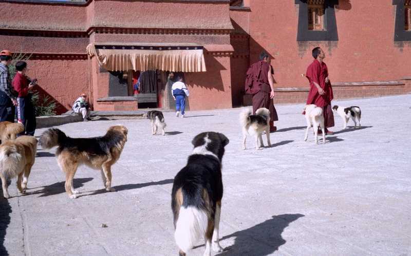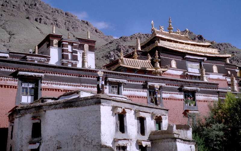 16.09.2001 Aber auch normale Wohnhäuser, wo Familien drin wohnen. Danach Marktbesuch in Shigatse und Mittagessen im Tensing-Hotel, es gibt gebratenen Yak, aber auch das erste Mal Nasenbluten beim Essen, was in dieser Höhe öfter auftreten kann. 15 Uhr Weiterfahrt entlang des Nyang Chu Flusses, unsere Fahrer suchen manchmal verzweifelt nach dem Weg, müssen nachfragen, Überschwemmungen scheinen hier an der Tagesordnung zu sein. Unterwegs wird noch in zwei Stunden das Getriebe eines unserer Jeeps repariert, der Fahrer bekommt den ersten und dritten Gang nicht mehr rein. Nach vielen Umleitungen, elenden Schüttelstrecken und Irrfahrten erreichen wir 20 Uhr zur Dämmerung die Stadt Gyantse (3950 m), steigen im Wutse-Hotel in einer für hiesige Verhältnisse eleganten Luxussuite ab, alles vom Feinsten.